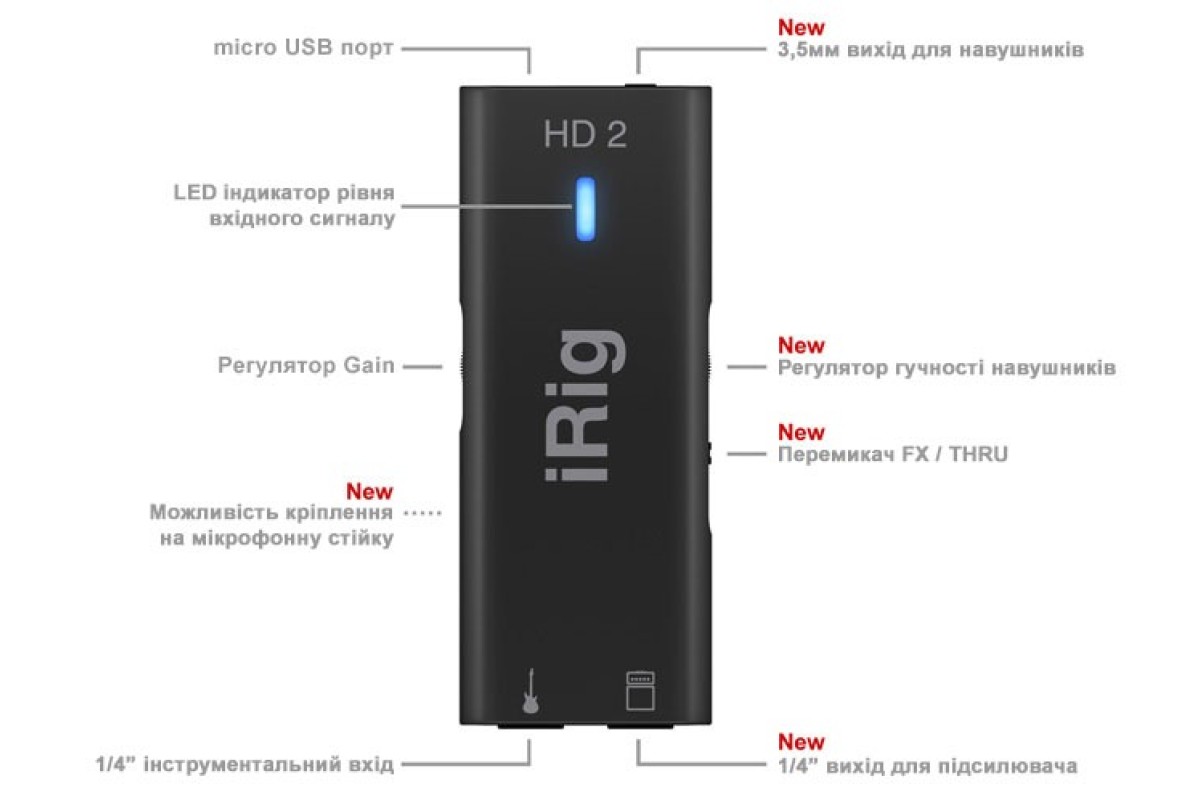 Комплектація: iRig HD2, Lightning–Micro USB кабель, USB–Micro USB кабель, кліпса для кріплення, липучка Velcro