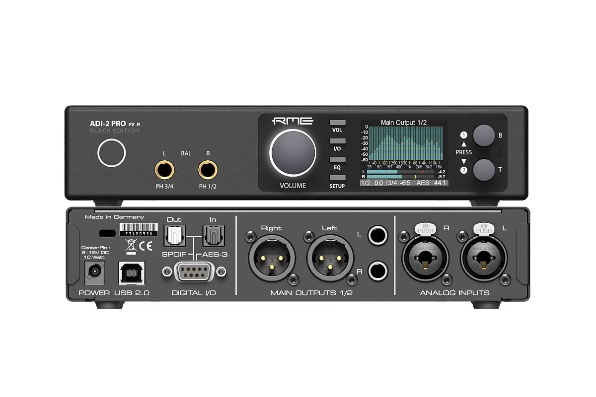 RME ADI-2 Pro FS BE оснащен IPS дисплеем с высоким разрешением, который упрощает работу и отображает измерения сигналов всех входов/выходов, текущие цифровые состояния S/PDIF, AES, USB, 30-полосный анализатор и многое другое. Существует и режим AutoDark, автоматически выключающий все светодиоды и экран через десять секунд бездействия пользователя.
