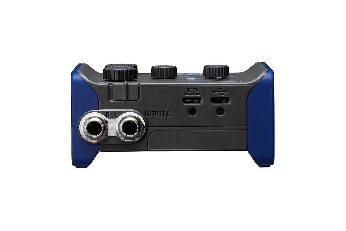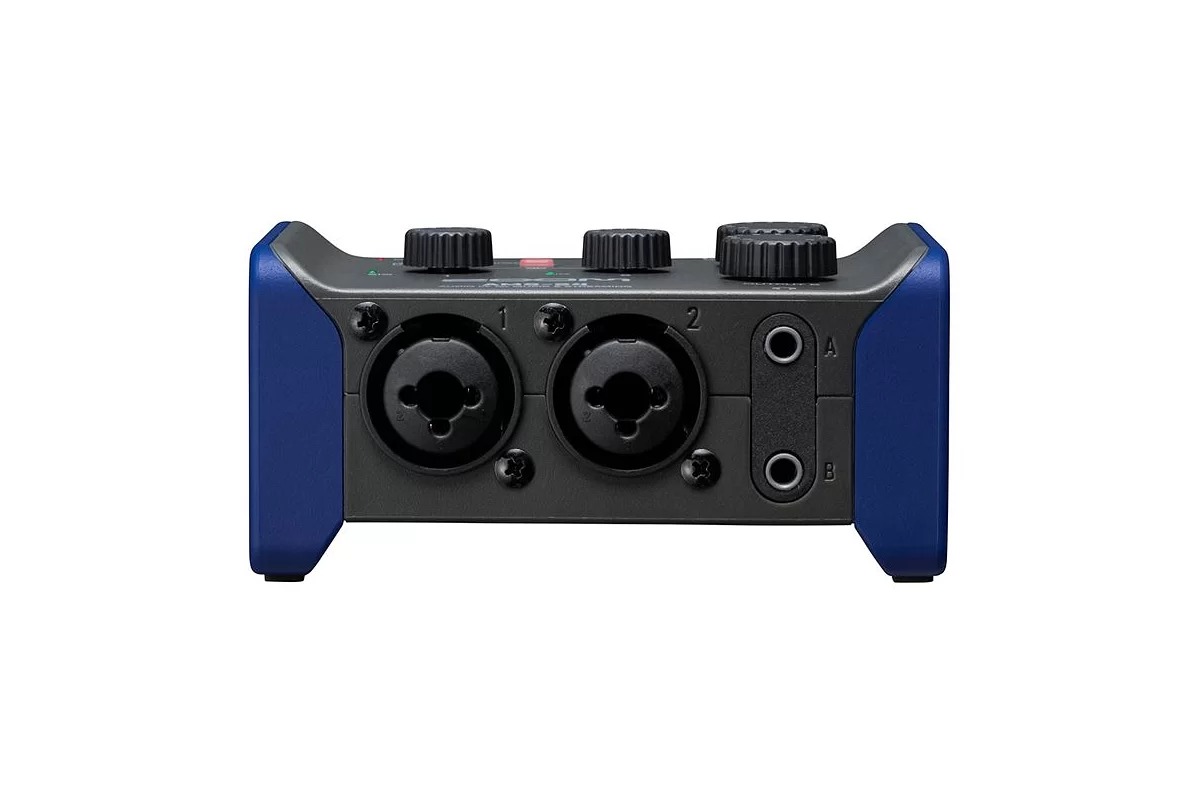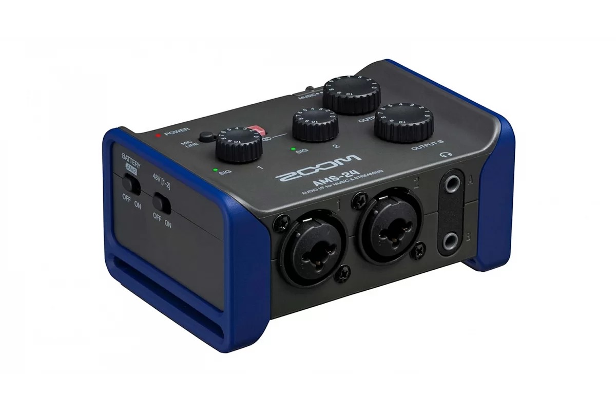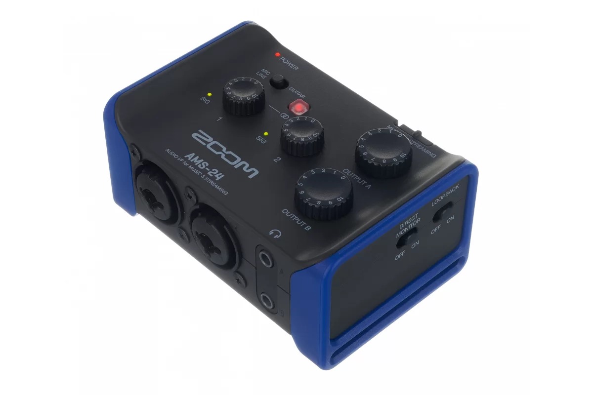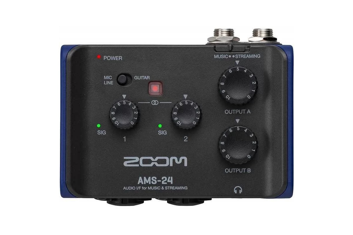 Zoom AMS-24 – портативный полевой аудиоинтерфейс с основными функциями студийных устройств. AMS 24 получил 2 USB-C порта для максимальной гибкости. Один порт представляет собой интерфейс, второй порт для питания от павербанка, кроме того, аудиоинтерфейс работает от 2 АА батарей (переключателем). Ключевые функции аудиоустройств разнесены корпусом: входы/выходы, регуляторы усиления, громкости, переключатели режимов и фантомного питания.