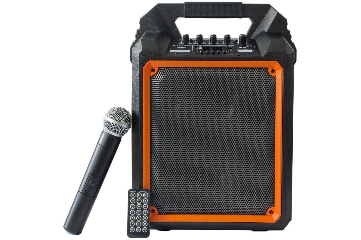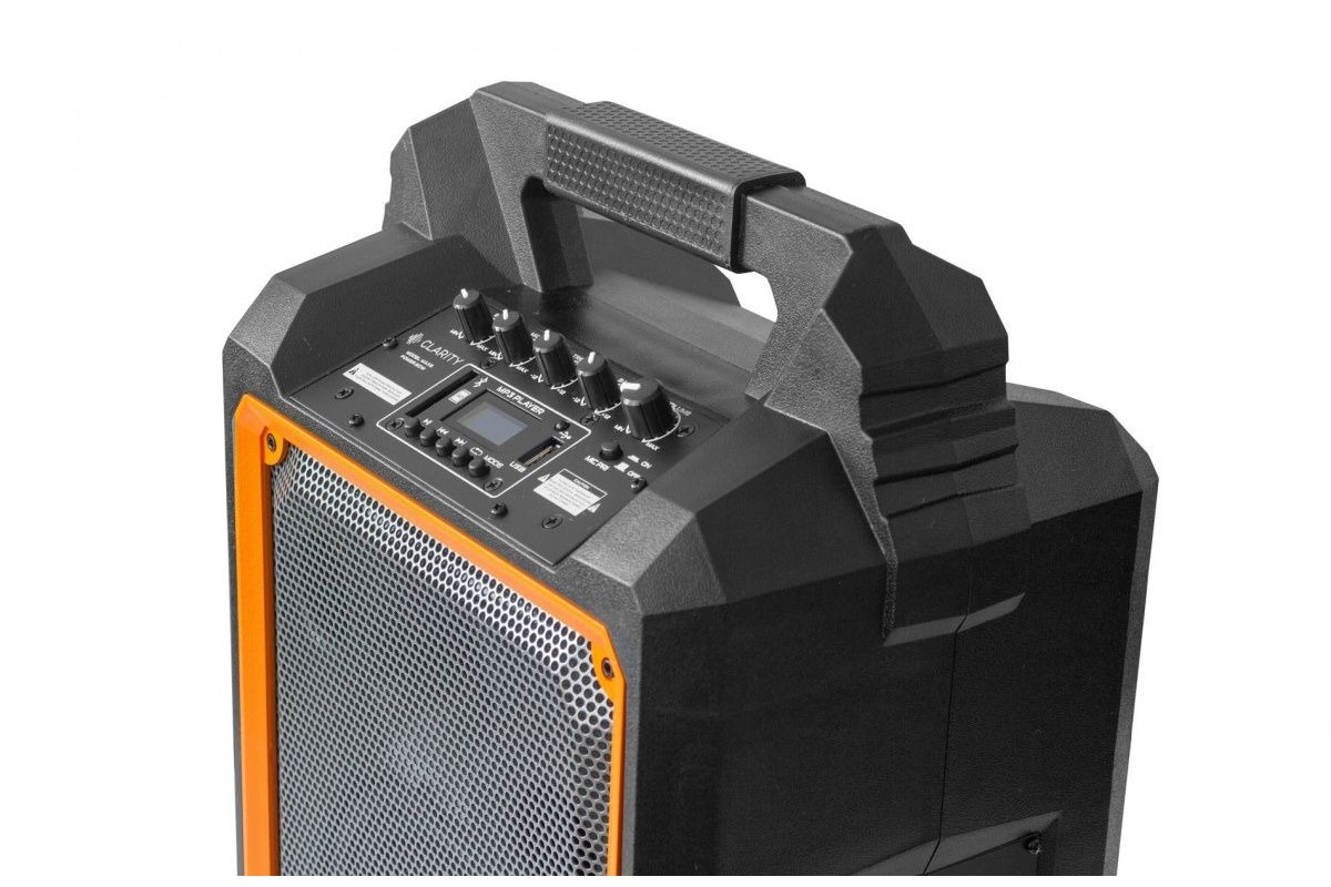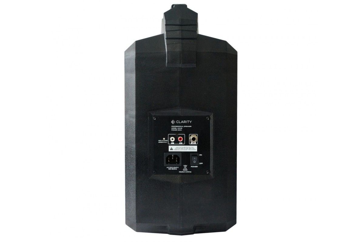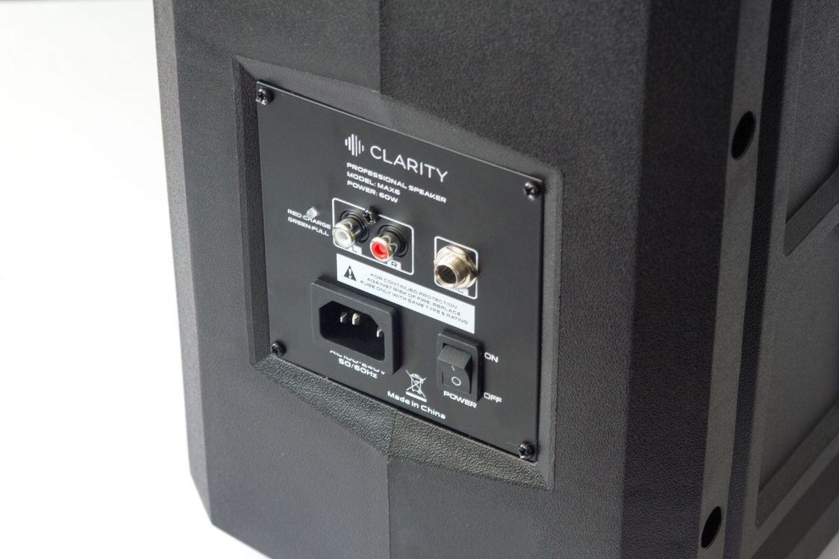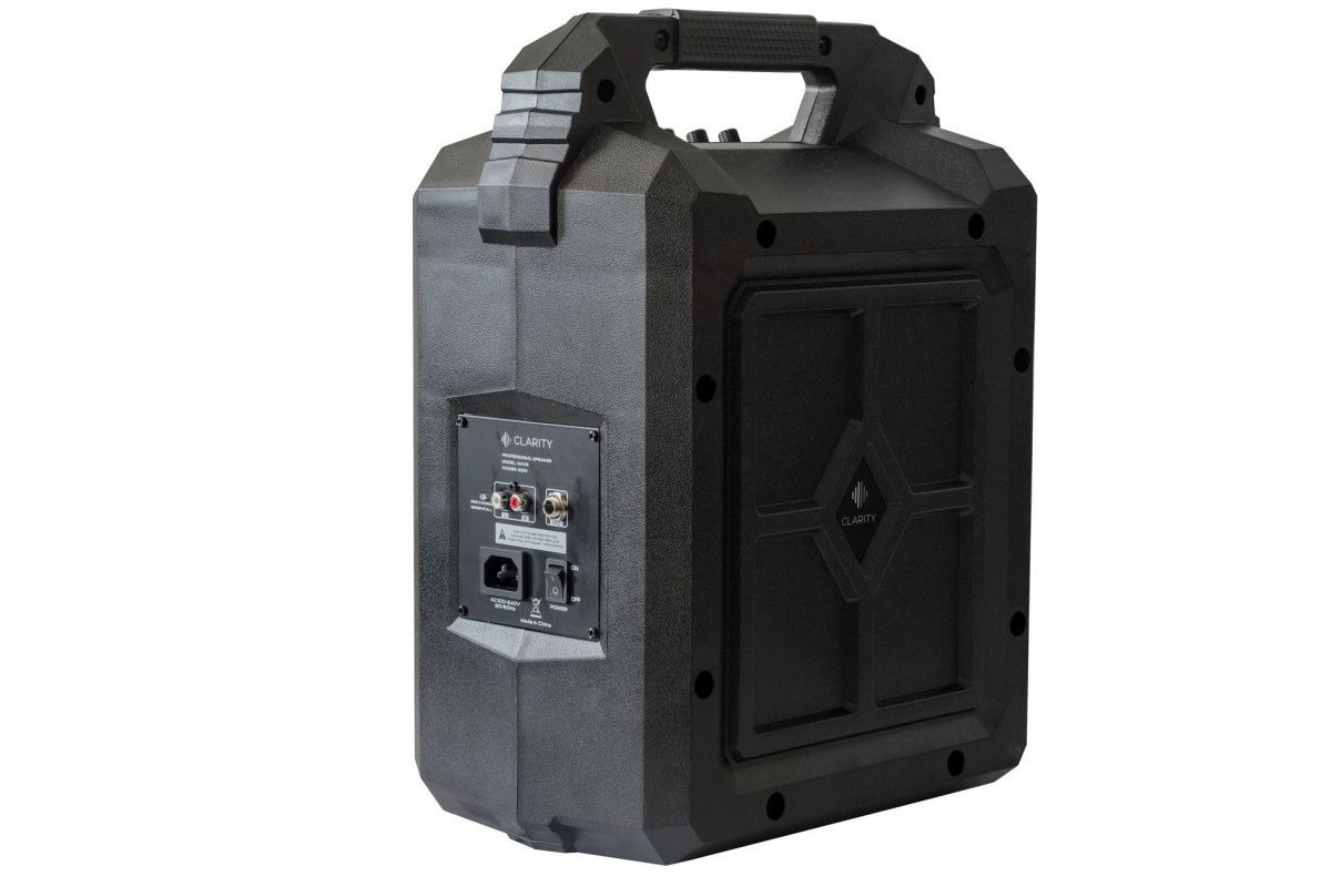 Активная переносная акустическая система Clarity MAX6W с автономным питанием от аккумулятора и встроенной беспроводной радиосистемой и ручным микрофоном рабочего диапазона UHF. На боковой панели акустики расположен встроенный усилитель, на панели которого расположены микрофонный и линейный входы, сетевая кнопка включения и сетевой порт ввода.