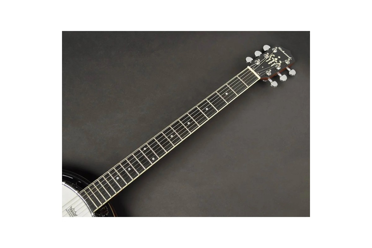 Корпус банджо имеет обед и резонатор красного дерева, что способствует яркому и четкому звучанию. Верхняя дека выполнена из пластика Remo Weatherking диаметром 11", что обеспечивает стабильный и приятный тембр. Бридж изготовлен из клена с накладкой с накладкой из черного дерева.