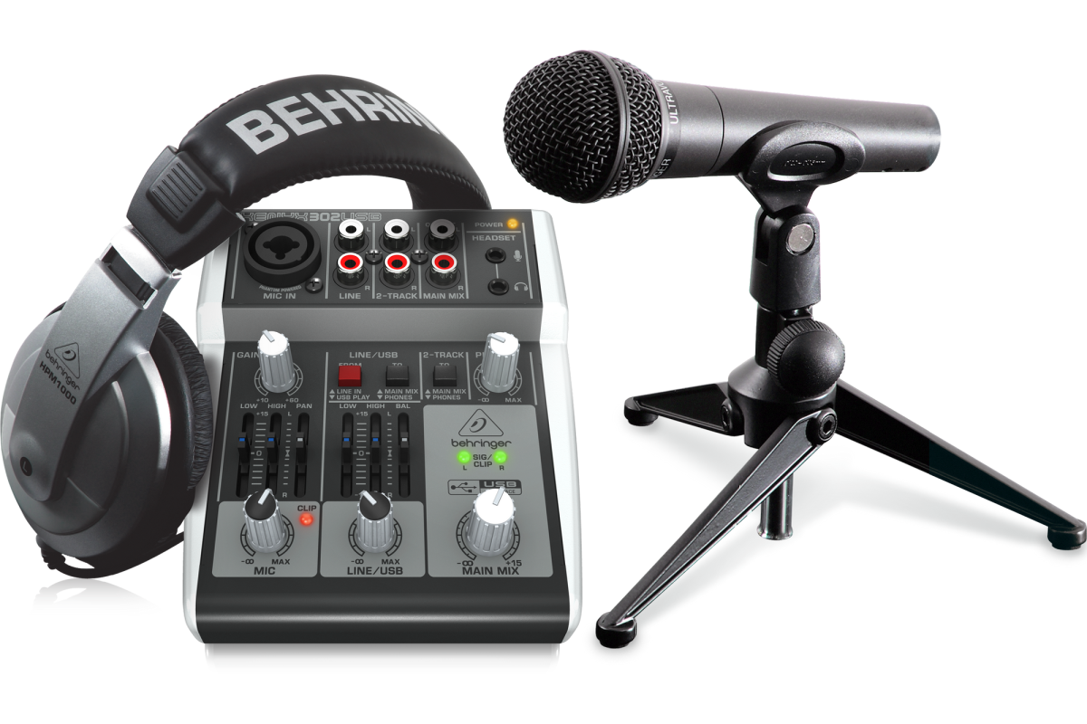 PODCASTUDIO 2 USB – это мощный пакет студийной записи. Xenyx 302USB. Этот 5-канальный микшер – центр бандла. XLR-вход с фантомным питанием, вход стерео line/USB и стереовход на 2 канала. У каналов на микрофон и линейный сигнал имеется 2-полосный эквалайзер. Новый микшер работает как USB-аудиоинтерфейс. В качестве микрофона используется Behringer Ultravoice XM8500. Кардиоидная диаграмма, а частотный диапазон составляет 50 Гц – 15 кГц. Микрофон поставляется со стойкой, чехлом, настольной крепью и кабелем XLR. Для мониторинга предлагаются наушники Behringer HPM1000 с овальным корпусом. Кабель оснащен разъемом ⅛ TRS и переходником на 1/4.
