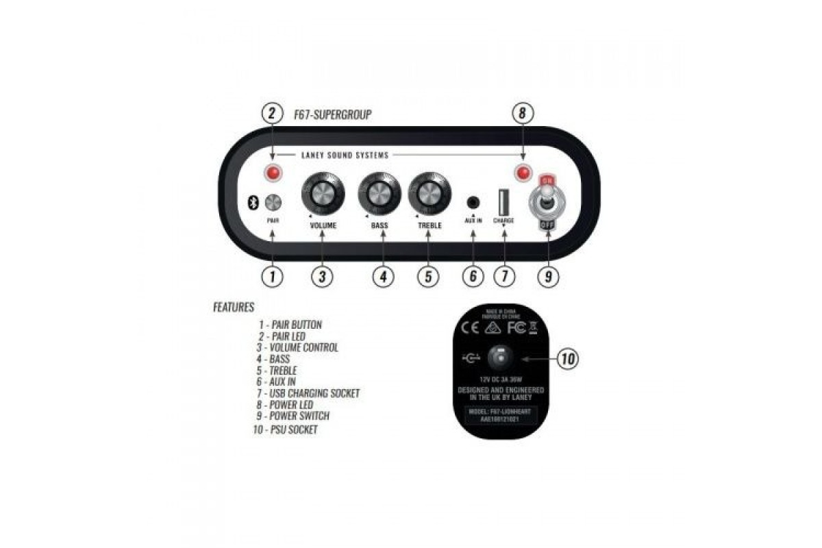 Laney F67 – беспроводная акустическая система. Выполнена в деревянном корпусе в стиле легендарных усилителей Laney Supergroup. Быстрое и легкое соединение по Bluetooth с вашим мобильным устройством. 4-х дюймовый динамик и два высокочастотных твиттера обеспечат мощные басы и кристально чистые высокие частоты в режиме HD Wide Stereo. На верхней панели системы расположен вход AUX, светодиодные индикаторы bluetooth соединения и состояния батареи, кнопки управления (громкость, регулировка высоких и низких тонов, кнопка сопряжения.), а также стандартный разъем USB, который позволит использовать колонку в качестве powerbank для различных мобильных устройств.