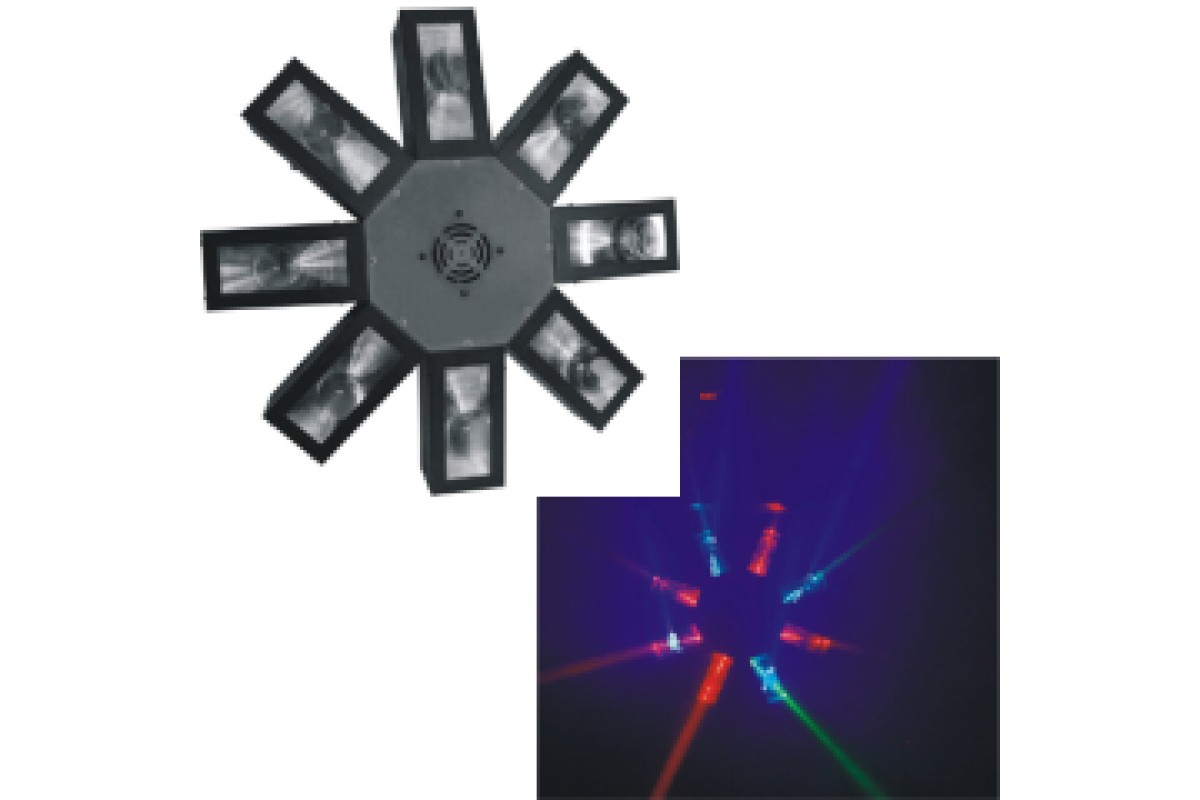 BIG BMOCTOPUS — потужний центральний світловий сканер з LED-проектуванням для клубів, концертів та сценічних шоу. Використовує 32 світлодіоди по 3 Вт з підтримкою RGBW для насиченого кольорового світла. Прилад оснащений вісімома "лапами" з лінзами, які проектують кольорові промені під різними кутами для створення динамічних ефектів. Підтримує DMX-управління на 6 каналах, а також звукову активацію та автоматичні режими.