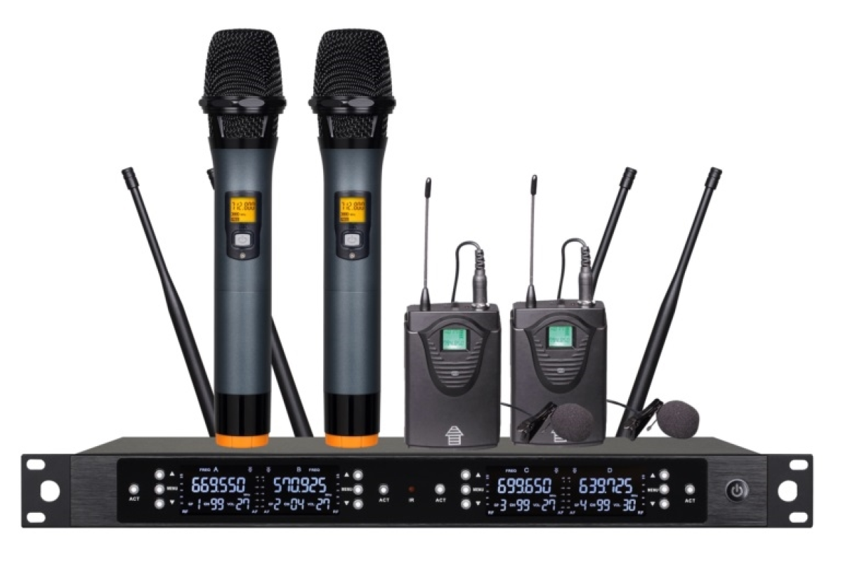Беспроводная четырехканальная микрофонная система с двумя ручными микрофонами и двумя передатчиками с петличными микрофонами
