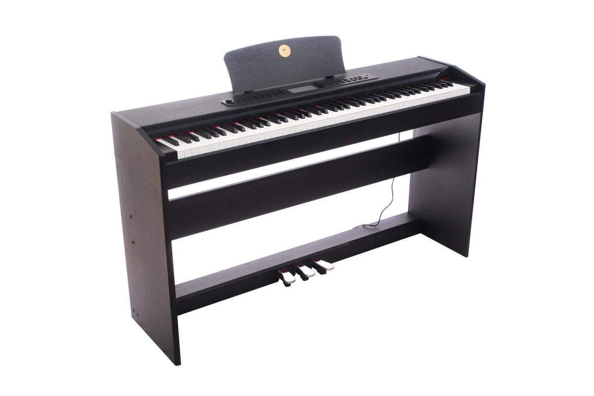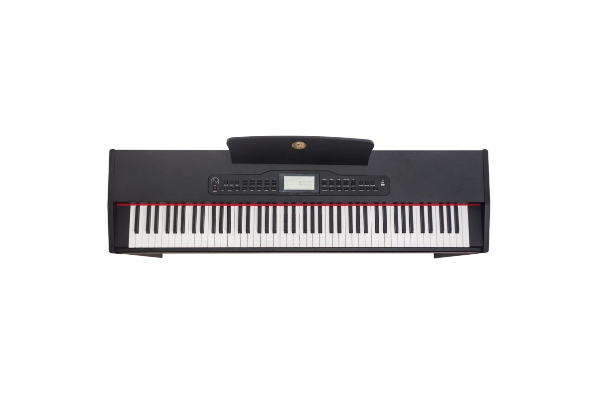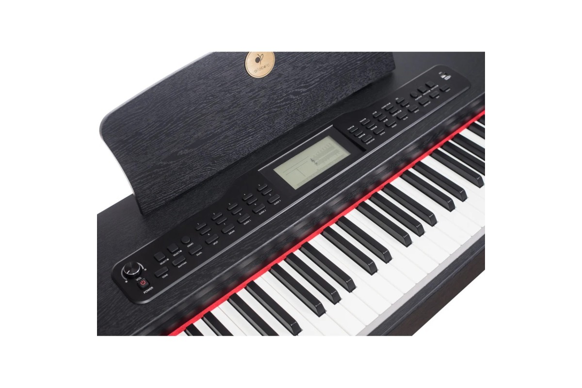 Alfabeto Vivo – 88-клавишное цифровое пианино с молоточной механикой, функцией беспроводной связи Bluetooth и встроенным 15-ваттным динамиком. Vivo имеет активную клавиатуру, чувствительную к силе нажатия (16 уровней). Чем сильнее будет нажата клавиша, тем сильнее получится звук. Вес клавиатуры тяжелее на низких нотах и легче высоких, поэтому воспроизведение меняется постепенно в зависимости от диапазона звука, давая Вам ощущение от игры, как на обычном пианино. Новая технология чипа France Dream5 Series (5504) обеспечивает высокое качество звука по самой низкой цене, давая возможность получить отличный опыт от игры. В комплект входит: стойка, блок питания, гарантийный талон, сертификат качества, руководство пользователя и блок педалей (сустейн, состенуто, софт), подключаемый через соответствующий разъем. Также есть разъемы USB, аудио и для подключения наушников. Для удобства управления в данной модели предусмотрен ЖК-дисплей. Также есть место для размещения нотных тетрадей. Пианино выполнено в черном цвете.