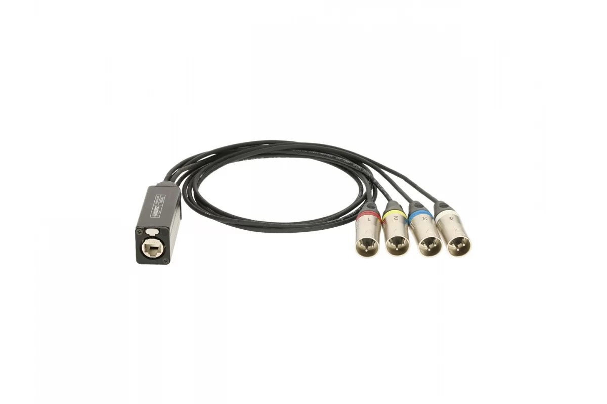 Адаптер с внутренней разводкой на четыре канала, каждый канал выведен на отдельный кабель длиной 0.8 метра с разъемом XLR 3 штекер на конце. Кабель каждого канала выполнен на основе балансного цифрового кабеля OmniTRANS и «готов к цифровому подключению», т.е. рассчитан на волновое сопротивление 110 Ом, что важно при работе с сигналами AES/EBU или DMX. Возможна передача фантомного питания 48 Вольт. Разъемы XLR 3 промаркированы цветными кольцами.