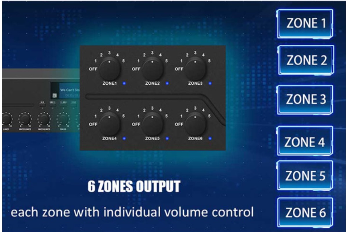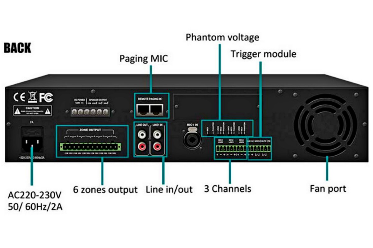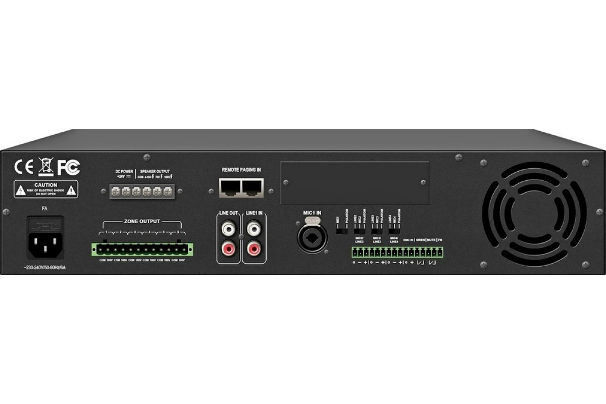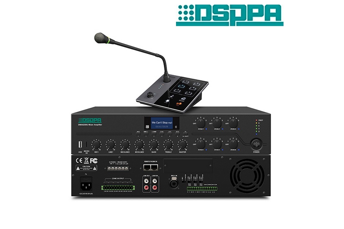 Цифровой микшерный усилитель DMA6650U можно использовать вместе со станцией удаленного пейджинга DMA20, поддерживающей 2-канальный микрофон удаленного пейджинга с разъемом RJ-45. Усилитель имеет экран для интуитивно понятного отображения с такими источниками входного сигнала, как 4 микрофона, 4 AUX, USB, FM, Bluetooth и TF. Он также обеспечивает функцию защиты при перегрузке, коротком замыкании и превышении температуры. Это усилитель, объединяющий множество функций удовлетворения потребностей пользователей.