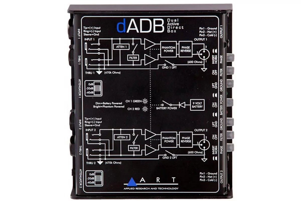 Двухканальный активный директ-бокс ART dADB работает, как два независимых высококачественных интерфейса для подключения музыкального инструмента или линейного сигнала, имеющих небалансный выход, в балансный вход пульта микшера.