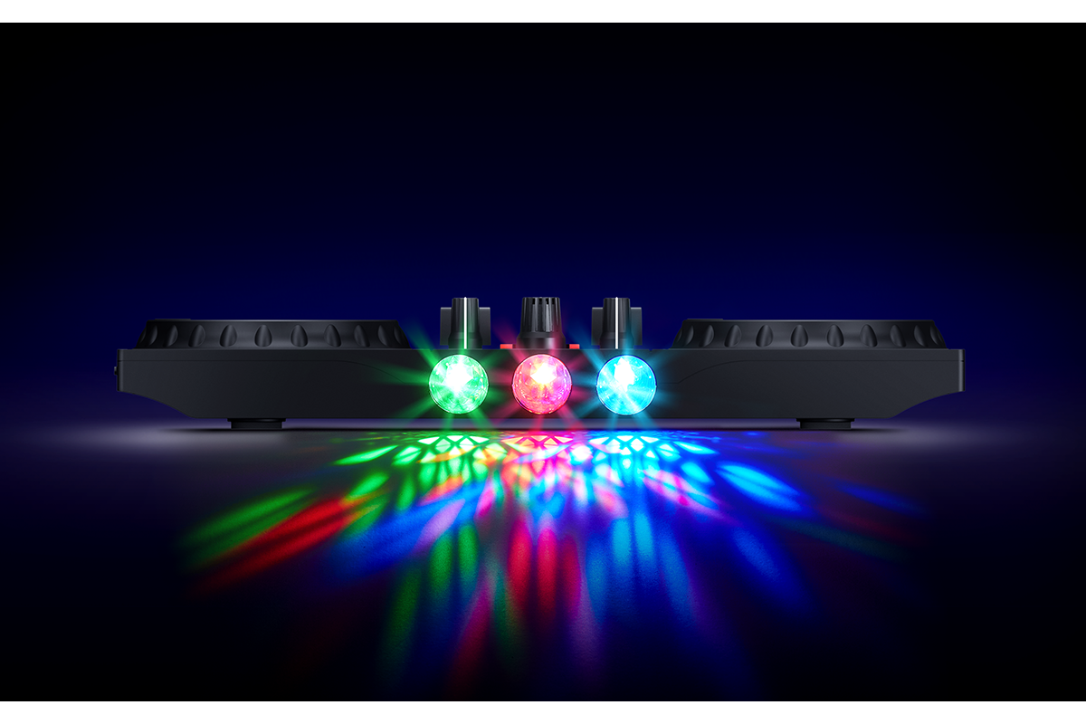 Создайте атмосферу вечеринки с помощью DJ-контроллера с подсветкой! Party Mix II оснащен тремя разноцветными светодиодами со специальными линзами с широким охватом для яркого светового шоу с синхронизацией заполняющего всю комнату ритма. Переключатель на боковой стороне контроллера позволяет включать и выключать световое шоу в любое время.