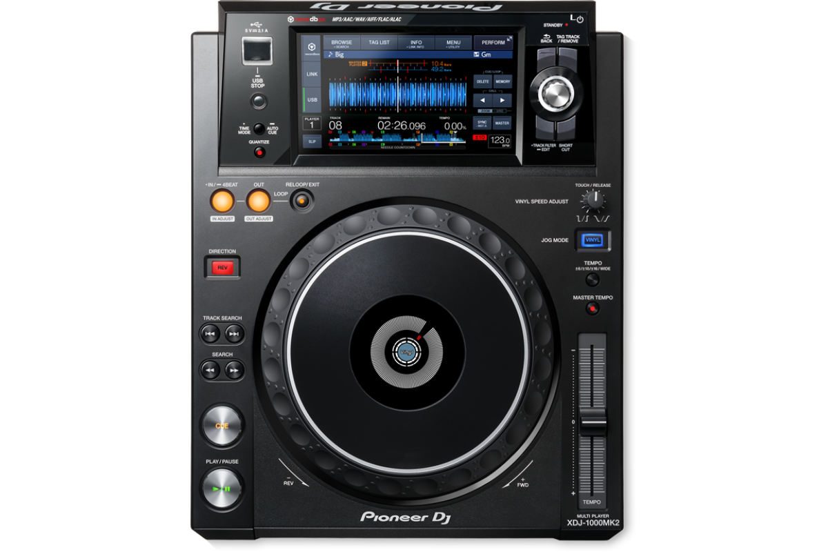 Pioneer XDJ-1000MK2 – это мультиформатный USB-проигрыватель для диджея. Модель сохранила основные характеристики из предыдущего поколения: QWERTY-клавиатуру на сенсорном экране для поиска по ключевым словам, прокрутку списка результатов поиска прямо на экране (с помощью данной клавиатуры или с большого джога). Обеспечивается моментальный доступ к предварительно заданным точкам запуска, петель и специальным настройкам, также можно запрограммировать цветовую индикацию для USB-накопителей: данная функция подсвечивает USB-слот с помощью светодиодов, и есть несколько вариантов для каждой флешки индивидуально. Также можно подключить контроллер DDJ-SP1 (продается отдельно), чтобы управлять новыми функциями Pioneer XDJ-1000MK2 (включая восемь меток Hot Cues) с помощью больших педов. Будучи подключенным, DDJ-SP1 может управлять четырьмя устройствами серии XDJ (максимальное количество) с помощью протокола Pro DJ Link: данный протокол позволяет воспроизводить треки с одного USB-устройства на четыре плеера серии XDJ (максимальное количество), а также пользоваться информационным сервером и другими функциями.