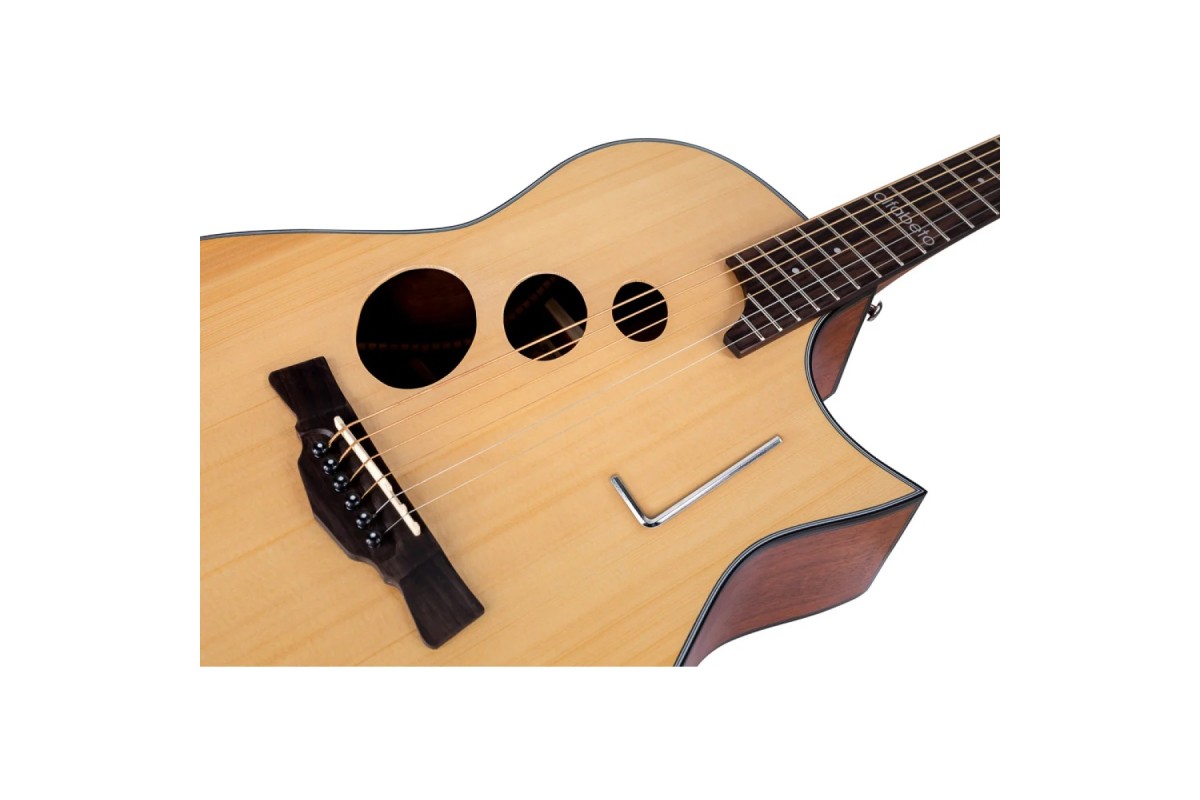 Для ищущих футуристическую электроакустическую гитару со смещенными звуковыми отверстиями Alfabeto Gamma станет отличным вариантом. К тому же, в комплекте идет элегантный чехол хорошего качества, поэтому Вам не придется дополнительно покупать этот важный аксессуар.