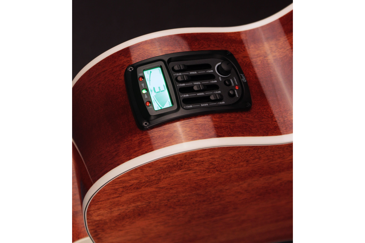 CJ-MEDX оборудована встроенным пьезозвукоснимателем и предусилителем Cort CE306T. 4-полосный эквалайзер позволяет точно отрегулировать звучание инструмента, а хроматический тюнер с LED индикаторами и ЖК дисплеем позволяет быстро и удобно настроить гитару даже на самой темной сцене.