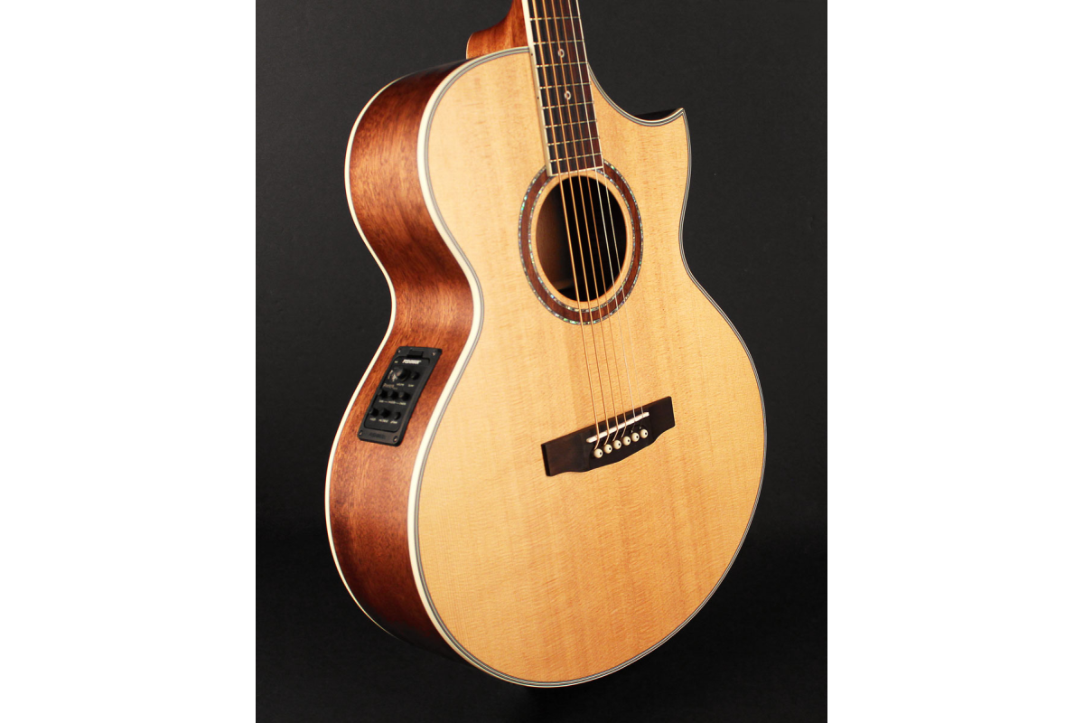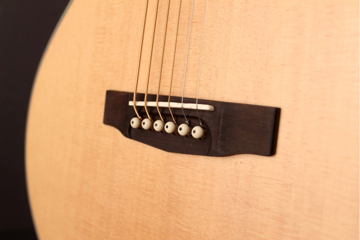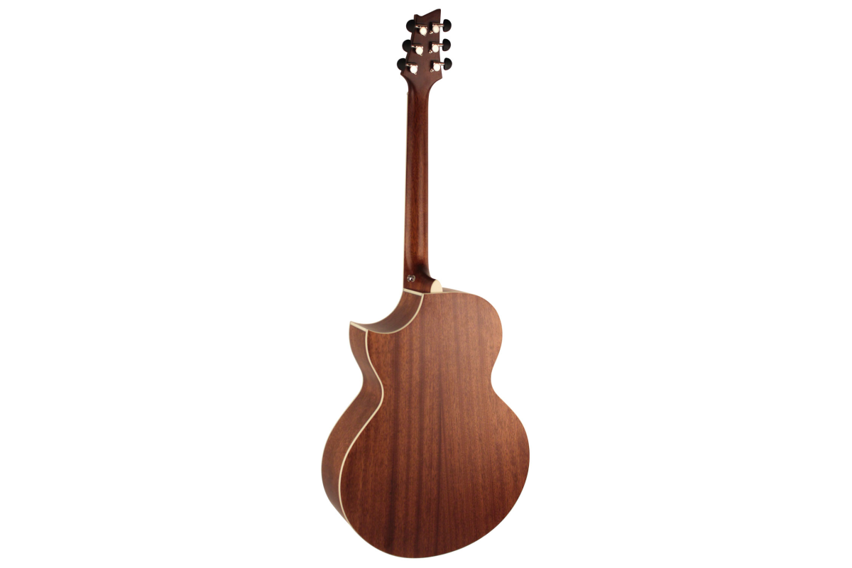 Верхняя дека из цельной ситхинской ели (Sitka solid spruce) обеспечивает яркий резонанс, а задняя дека из цельного африканского красного дерева (Okoume) придает теплоту и объем звучанию. Комбинация с Advanced Scalloped X-Bracing раскрывает полный потенциал инструмента, делая его универсальным как для сольной игры, так и для аккомпанемента.