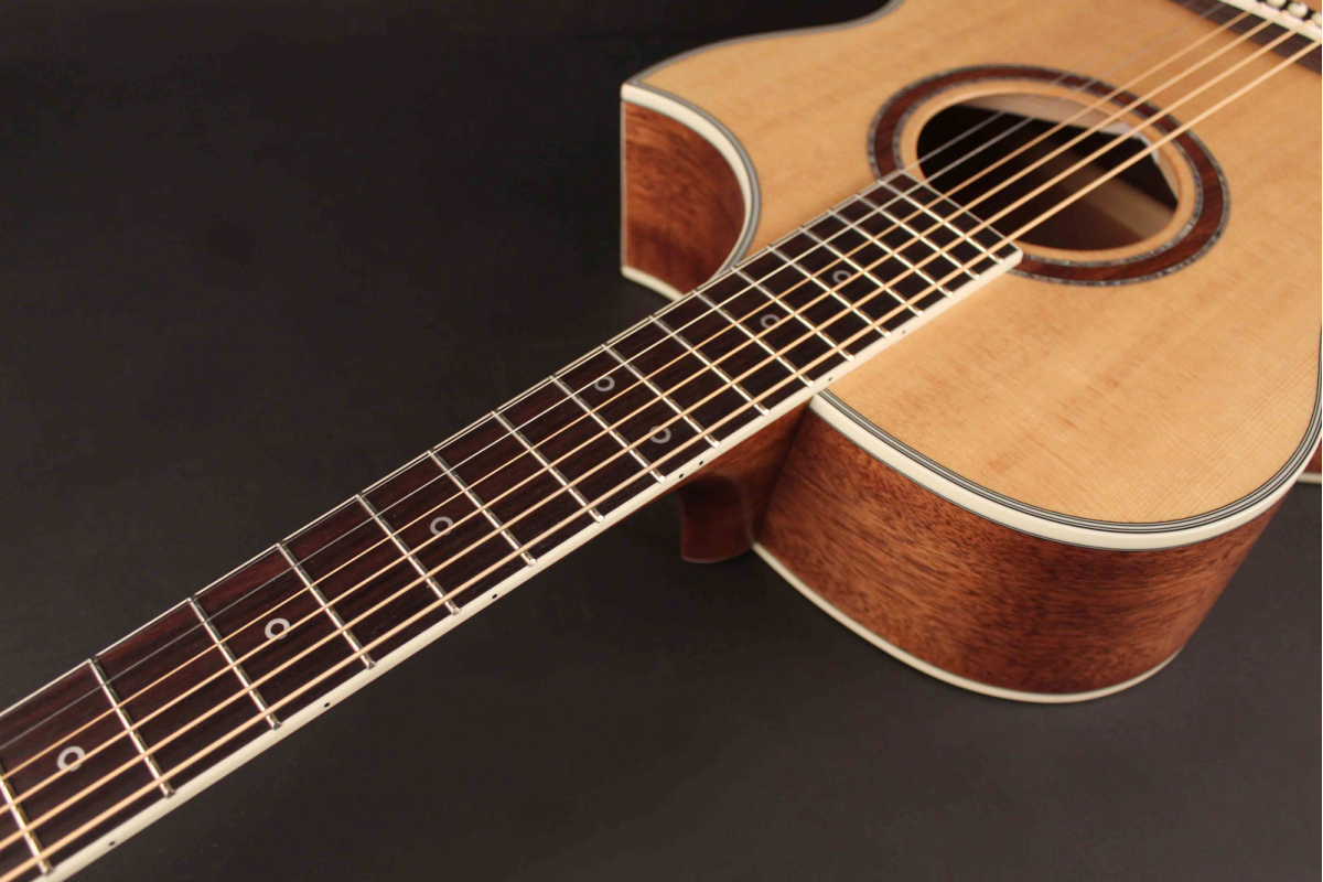 Удобный гриф из красного дерева с накладкой и бриджем из овангкола гарантирует комфорт при игре, а более широкий верхний порожок 45 мм делает инструмент особенно удобным для сложных аккордов и fingerstyle.