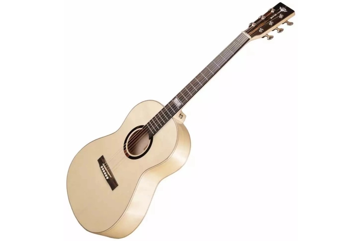 Tyma TA-50 это акустическая тревел гитара с корпусом полностью из цельного дерева. Инструмент получил не только поразительный внешний вид, но и классный звук. При производстве гитары использовался топ из цельной ельинской ели, нижняя дека и обечайки из цельного канадского клена.