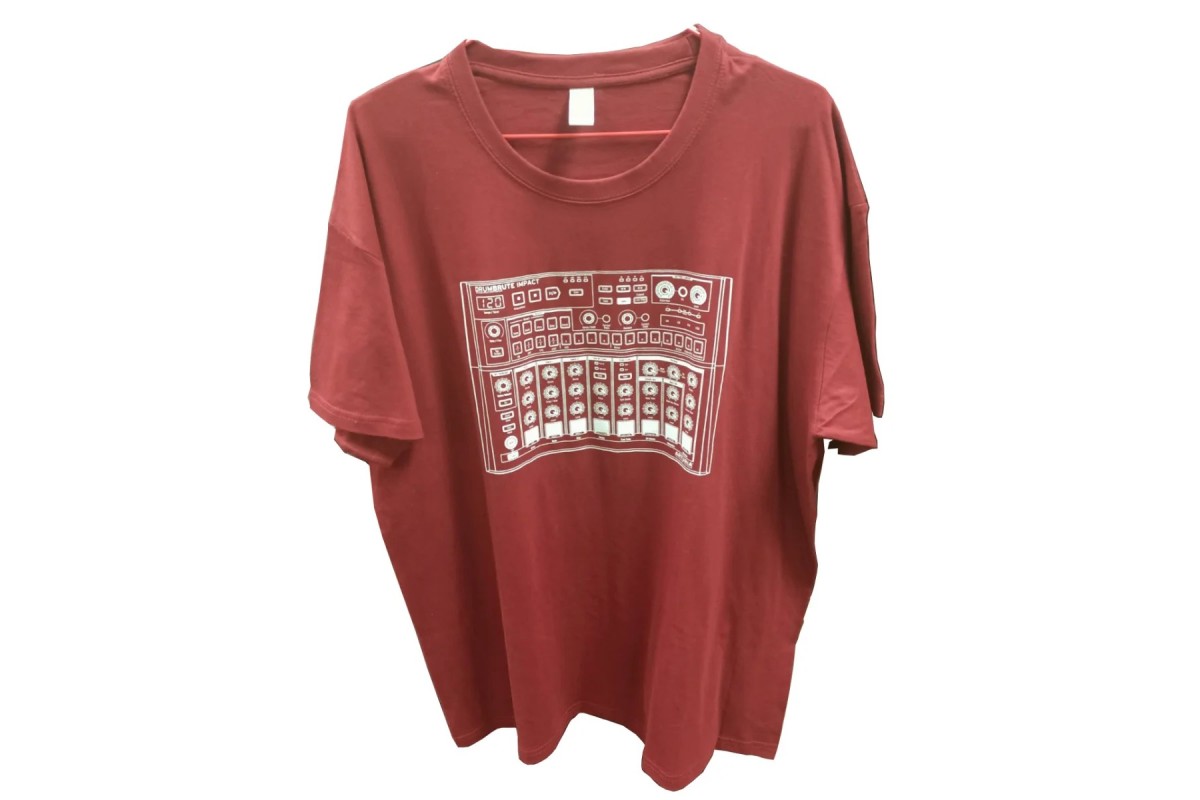 Красная футболка с изображением аналоговой драм машины DrumBrute Impact от Arturia. Материал: 35% – хлопок, 65% – полиэстер.