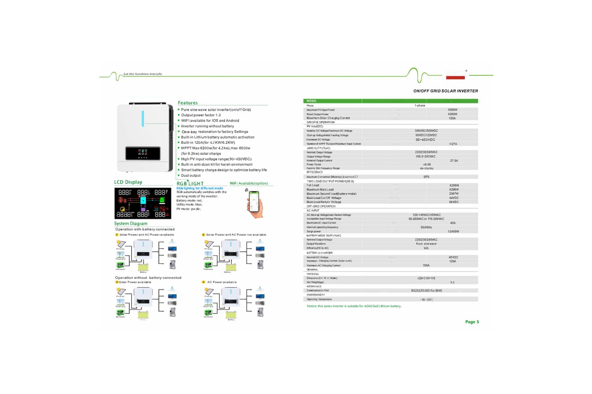 Гибридный инвертор HYBRID48V6200W – это высокопроизводительное устройство для создания автономных и сетевых систем питания. Поддерживает режимы ON-grid (отдача избыточной энергии в городскую сеть по зеленому тарифу) и OFF-grid (полностью автономная работа без сети).