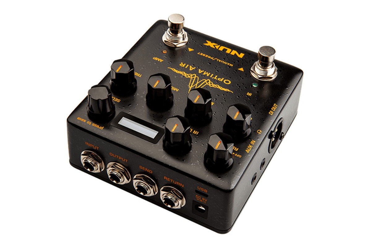 NUX Optima Air – это двухкнопочный симулятор акустической гитары с усилителем для гитаристов, играющих как на акустических, так и на электрогитарах. Он симулирует акустические гитарные профили, обеспечивая оптимальный звук в зависимости от гитары и типа звукоснимателя.