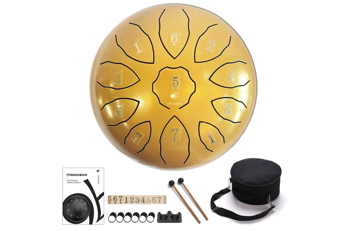 В комплекте идут: чехол, игровые палочки, 6 напальчников для пальцевой игры, подставка для палочек, запасные наклейки для нот и пользовательская инструкция. Этот глюкофон станет источником вдохновения, творчества и медитативного релакса.