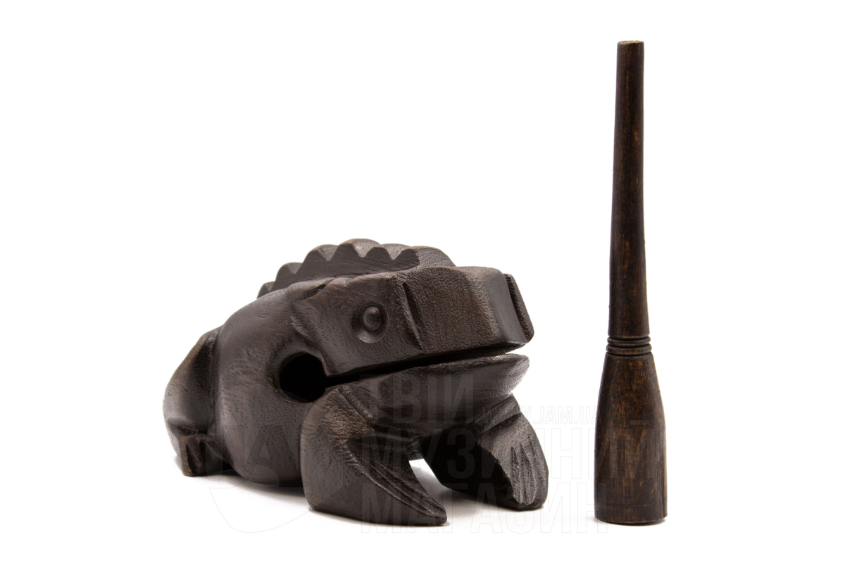 Инструмент выполнен в форме лягушки с вырезанными бороздками на спине. В комплекте идет деревянная палочка для игры.