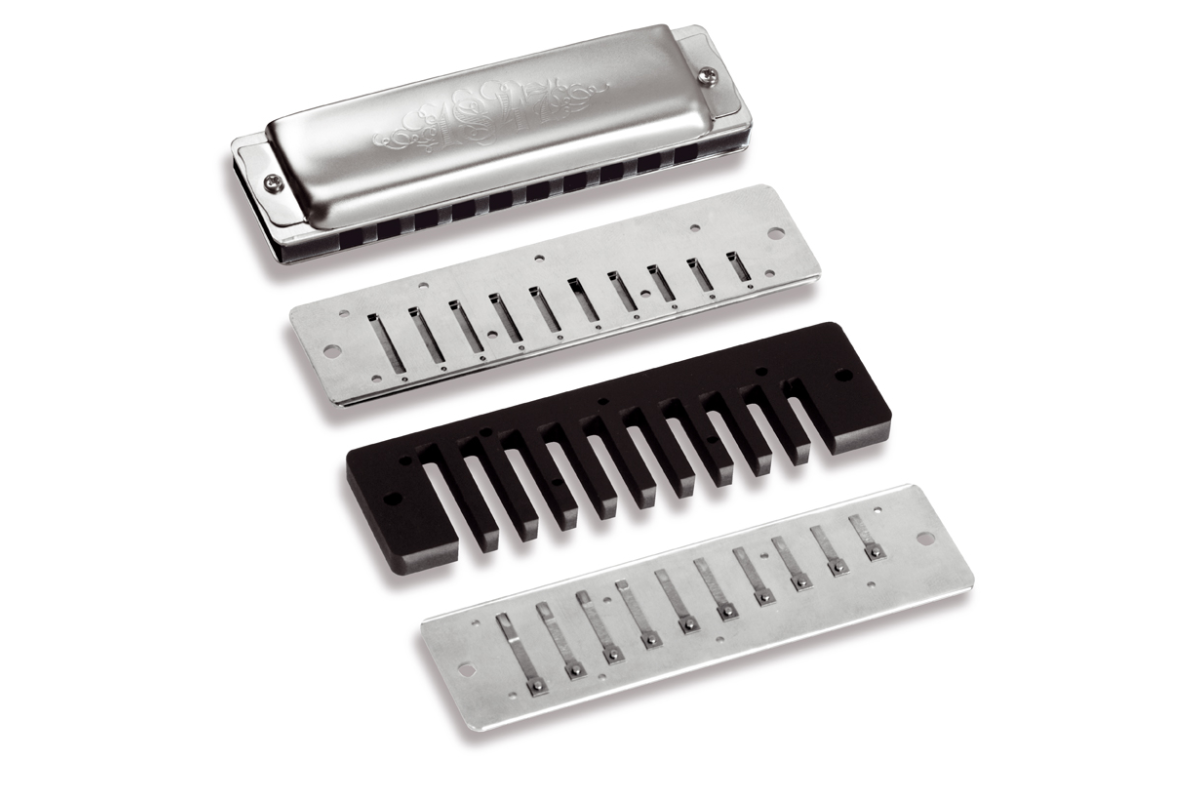 Конусная форма язычковых пластин в районе низких нот, предотвращает хрипы и искажения при игре на 1 и 2 отверстиях.