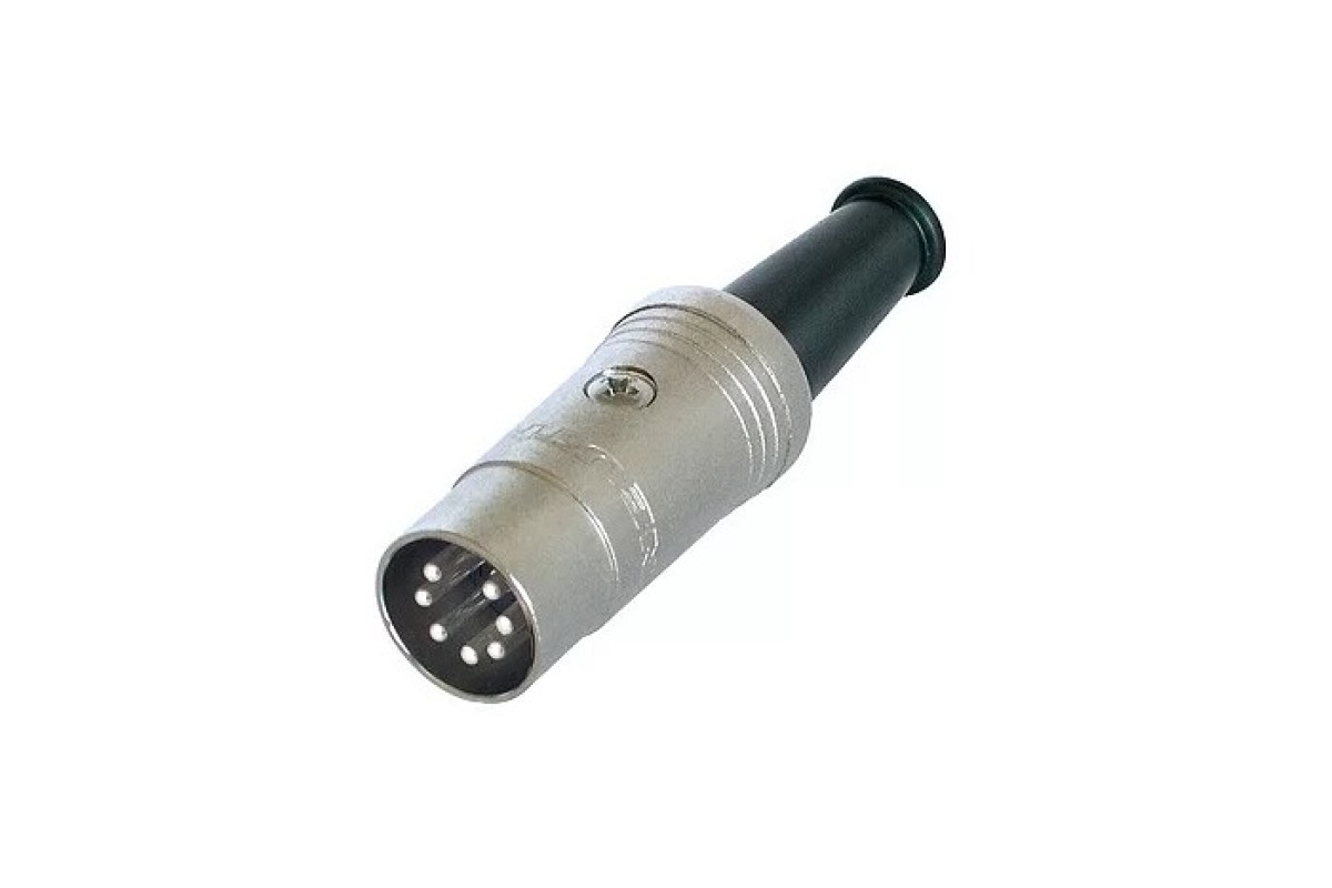 Кабельный разъем DIN, 7-й контактный, <штекер/папа>, металлический никелированный корпус, контакты – серебро покрытие, резиновый хвостовик, на кабель диаметром 5.0 мм.