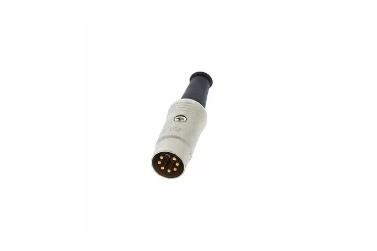 Кабельный разъем DIN, 7-й контактный, <штекер/папа>, металлический никелированный корпус, контакты - золотое покрытие, резиновый хвостовик, кабель диаметром 5.0 мм.