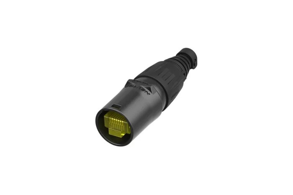 Кабельный разъем RJ45, EtherCON, CAT 6a (под стандартный модуль RJ45, в комплект не входит), чёрный металлический хромированный корпус, фиксирующий диск, зажимной патрон, полиуретановый колпачок, две вставки на кабель диаметром до 5.0 мм. и 8 мм.