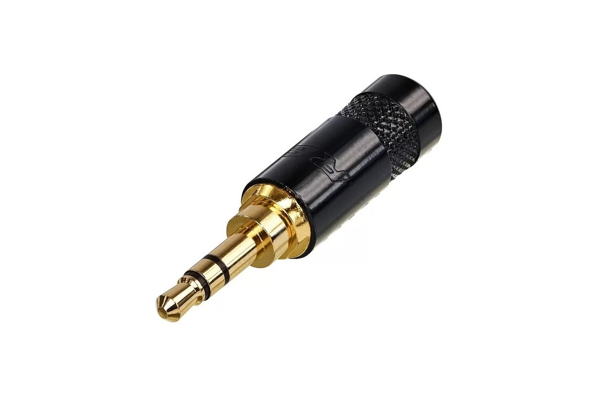Кабельный разъем mini Jack 3.5 мм, 3-х контактный (стерео) <штекер/папа>, черный металлический корпус, контакты – покрытие золото, под обжим, кабель диаметром до 8.0 мм.