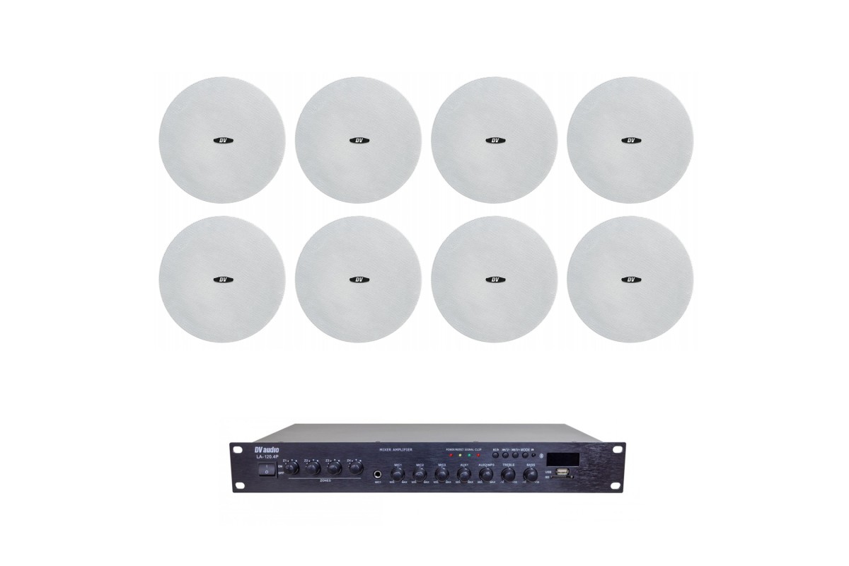 Комплект для фоновой озвучки помещений, офисов, кафе и открытых площадок средней площадью 120 кв. м. В комплект входит устройство воспроизведения звука на AC и набор акустических систем.
