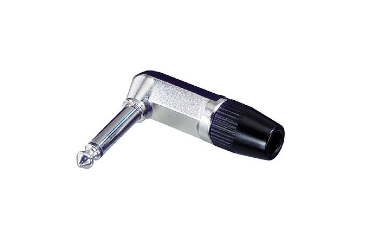Кабельный разъем 1/4" Jack, 2-х контактный (моно) <штекер/папа>, угловой, металлический никелированный корпус прямоугольной формы, контакты - покрытие никель, под пайку, пластиковый колпачок, на кабель диаметром до 6.0 мм.