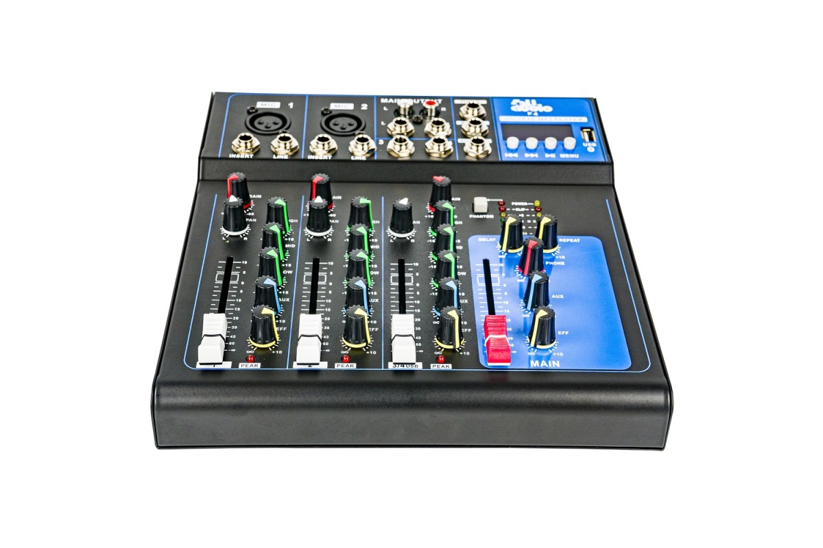 Микшерный пульт 4all Audio F4 - Пассивный микшерный пульт с 2 моно и 1 стерео каналом . Имеет фантомное питание 48V, позволяющее подключать конденсаторные микрофоны к данному пульту. Работает в частотном диапазоне 10Hz-45KHz S/N rate 98dB. Так же данный пульт имеет mp3 проигрыватель с USB разъемом и Bluettoh подключением. Для регулировки и калибровки звучания производитель предложил нам трехполосный эквалайзер, а для улучшения голоса – процессор эффектов.
