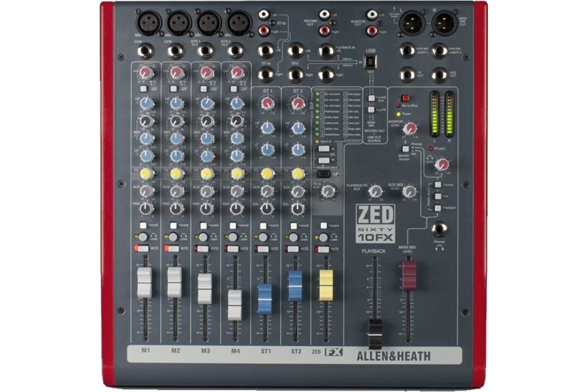 ZED60-10FX компактный и ультра портативный микшер для живого и студийного использования для артистов соло и маленьких групп. Основанный на самом продающемся ZED-10FX, новый ZED60-10FX отличается премиум класса 60 мм фейдерами для интуитивного тактильного микширования. Этот микшер – мечта гитаристов. Два из четырех моно каналов имеют высоко импедансные входы (джек), которые принимают нормальный и низкий линейный уровень от гитарных звукоснимателей и поэтому гитаристы могут непосредственно подключать гитару в микшер без необходимости в ди-боксах. Эти входы были разработаны с целью воспроизведения звука классических ламповых усилителей для невероятной четкости и теплоты. Два стерео входа позволяют подключать MP3/CD и клавиатуры. ZED60-10FX оборудован USB аудио входом/выходом, предоставляя легкую возможность стерео записи на концертах и в студии. Кроме того, здесь есть профессиональные XLR стерео выходы, гибкая секция мониторинга с выходами для наушников и спикеров и 16 потрясающих FX. Но самое важное из всего, ZED60-10FX создан в соответствии со стандартами качества, что делает Allen & Heath одним из самых доверяемых имен в профессиональной аудио индустрии вот уже более 40 лет.