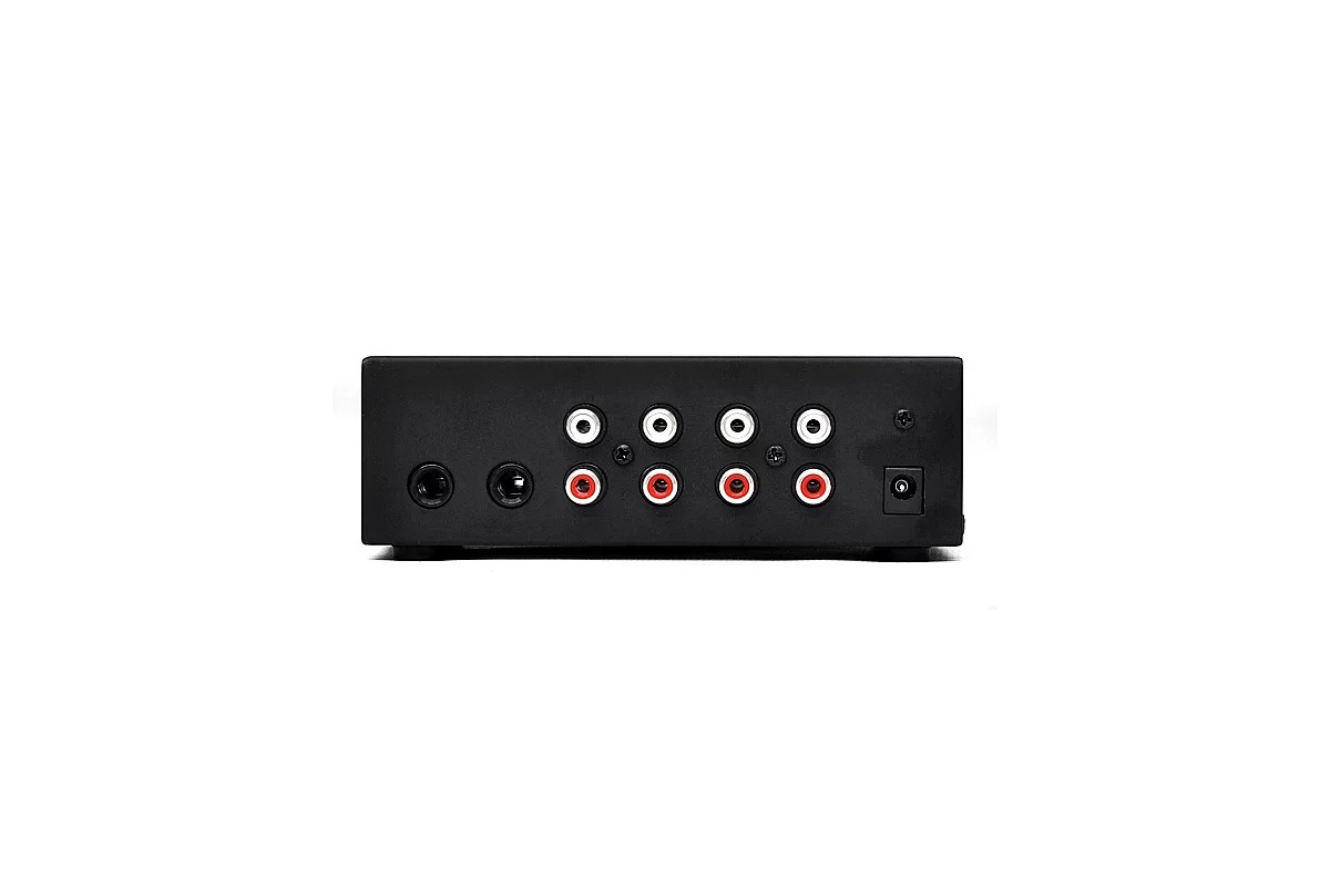 Четыре входных канала, каналы 1 и 2 имеют парные симметричные моно входы (разъем RCA), в канале 3 вы можете выбрать между парными симметричными моно входами (разъем RCA) или аналоговым входом (разъем 1/4" джек), канал 4 имеет небалансный аналоговый вход (разъем 1/4)