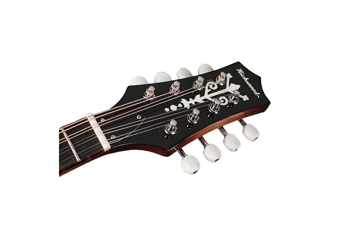 Верхняя дека Richwood RMA-90-NT украшена цветом грецкого ореха, а сам корпус имеет глянцевое покрытие. F-образные отверстия на верхней части и окантовка с имитацией черепаховой кости дополняют классический вид данного инструмента.