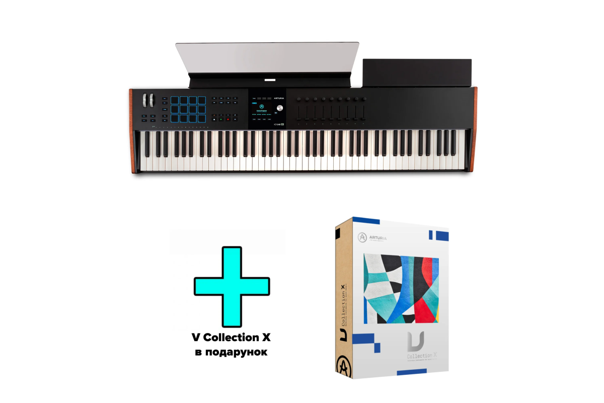 В комплекте идет V Collection X , содержащий 39 инструментов, среди которых легендарные синтезаторы, клавишные, органы, гибридные звуки и более 10 000 пресетов для использования через Analog Lab Pro , а также дополнительное ПО: Mini V, Piano V, Augmented STRINGS, Rev PLATE-140, Able подписка на Loopcloud и Melodics.