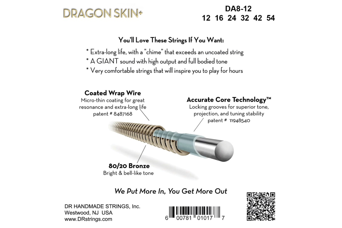 У Dragon Skin+ модернизированы как сердечник, так и обмотка, чтобы они были исключительно музыкальными, сбалансированными и громкими. Технология Accurate Core Technology™ создает канавки на сердечнике, чтобы удерживать обмотку, позволяя струнам звучать в полную силу.