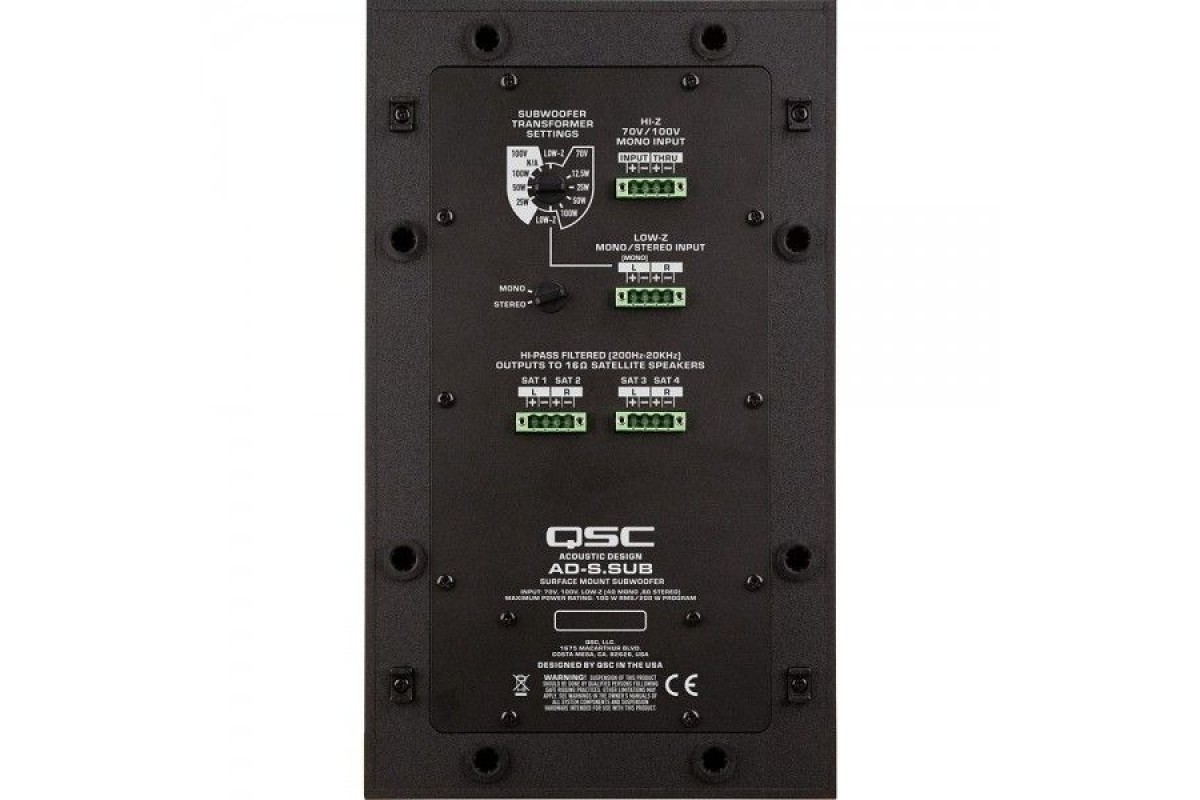 Акустическая система AD-S.SUB-BK (сабвуфер), 6,5" с двойной обмоткой, RMS/Program - 100/200Вт - 4Ом, 70/100В (100, 50, 25, 12,5 Вт), SPL 106 дБ (роз (1Втх1м) 86 дБ, 55 - 150 Гц, моно-вход (4-контактный разъем Euroblock с выходом thru), Low-Z вход (4-контактный разъем Euroblock, левый (моно) и правый), моно-выход hi-pass (2 4-контакт 10,7 кг, IP-34, цвет – черный.