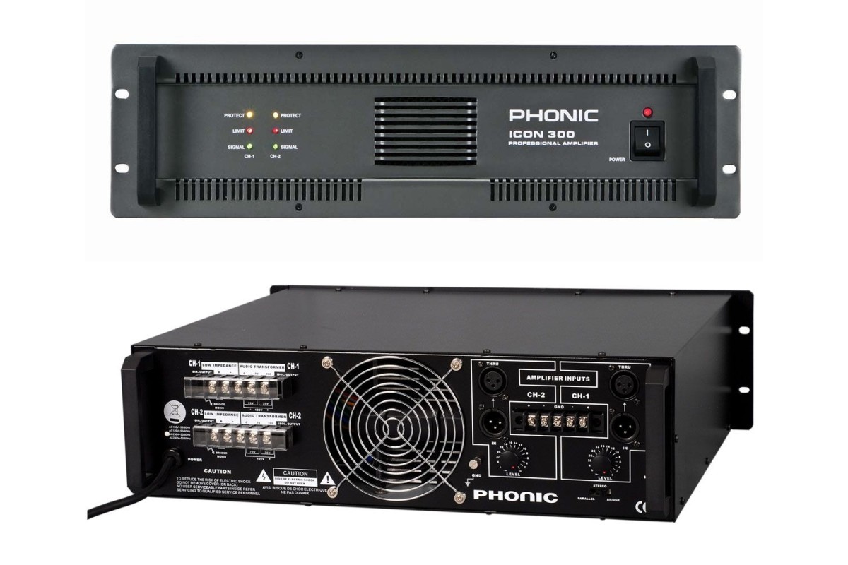 PHONIC ICON 300 – установочный усилитель мощности (3U), 2 х 120 Вт 8 Ом, 2 х 200 Вт 4 Ом, 2 x 300 Вт (EIA), 2 х 150 Вт 70/100 В, 2 х 120 Вт, 530 Вт 4 Ом, 200/140 В – 300 Вт, вход XLR и колодка, выход – клеммы.