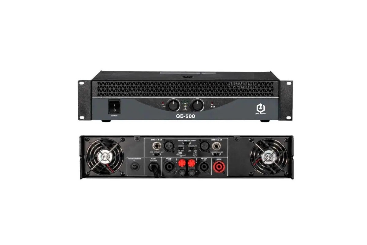 Усилитель мощности NRG Power QE-500 – это классический двухканальный усилитель класса AB с высококачественными тороидальными трансформаторами. Подходит для стационарных или временных инсталляций, например в барах, клубах или ресторанах. При сопротивлении в 2 Ом усилитель выдает по 1200 ватт мощности на каждый канал, при 4 Ом – 750 ватт, и в режиме работы в 8 Ом – 500 ватт, также данная модель может работать в моно режиме (bridge) 4 Ом. – 2200 ватт, 8 Ом – 1700 ватт.