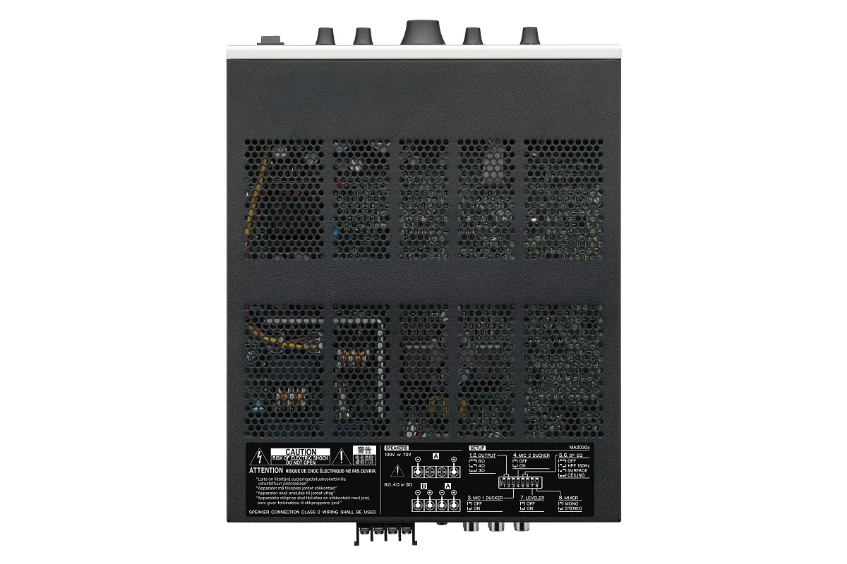 MA2030 оснащен тремя линейными стереовходами и двумя микрофонными входами с возможностью микширования, плюс DSP функции (дакер, подавитель обратной связи, автоматический регулятор уровня) для одновременного использования микрофона и фоновой музыки.