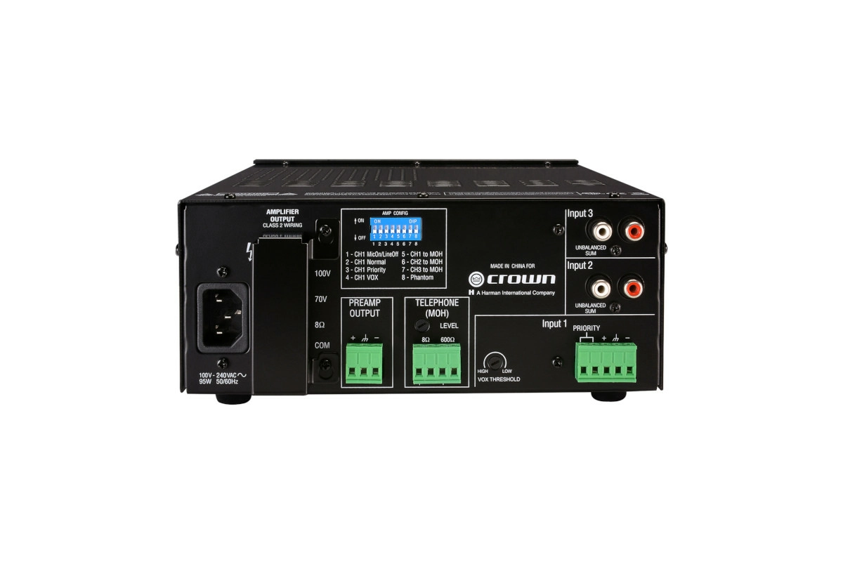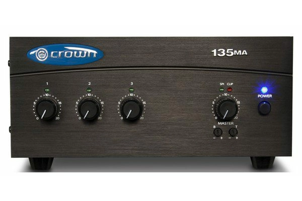 Crown 135MA и 160MA – это качественные микшеры-усилители для коммерческого аудио. Они обеспечивают 8-омные выходы постоянного напряжения (70 В и 100 В). Типичное применение – пейджинг, фоновая музыка и музыка на иждивении. Модель 135MA имеет 3 входа (каждый с регулятором громкости) и выходной усилитель мощностью 35 Вт. Модель 160MA имеет 4 входа (каждый из регулятора громкости) и выход усилителя мощностью 60 Вт. Другие особенности включают в себя приоритетное отключение звука, отключение звука с голосовой активацией, фантомное питание, а также регуляторы низких и высоких частот.