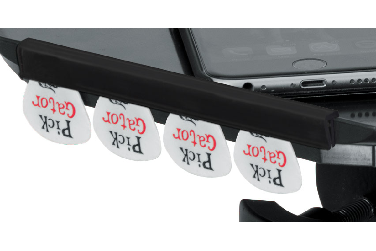 Если вы любите использовать разные медиаторы на сцене или просто регулярно их теряете на помощь, придет встроенный прорезиненный пикхолдер на ребре подставки, позволяющий закрепить до пяти медиаторов.