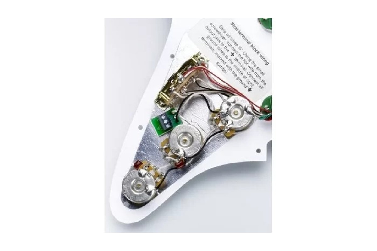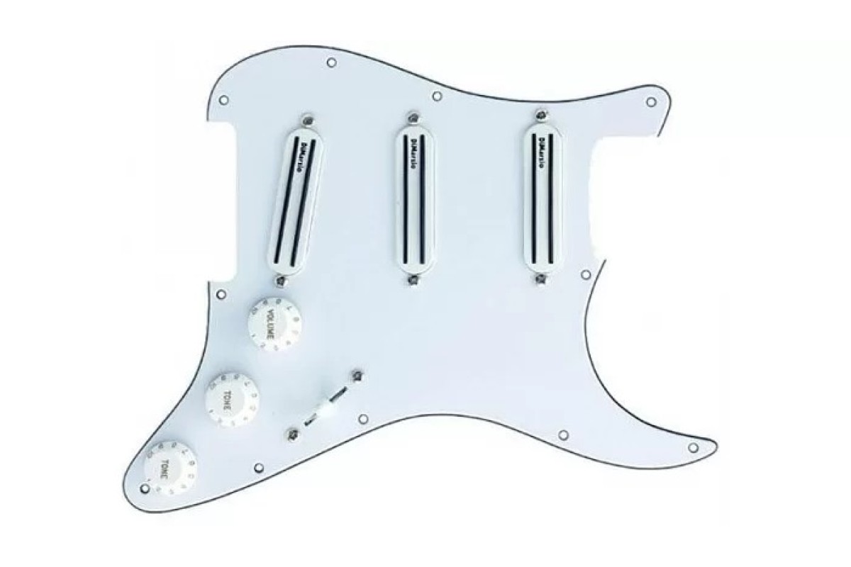 DiMarzio HIGH POWER Strat Replacement Pickguard – готова панель для гітар типу Stratocaster із вбудованими звукознімачами та електронікою. Повністю сумісна зі стандартними Фендерівськими пікгардами на 11 саморізах. Панель доступна у білому кольорі та під замовлення може бути виконана у інших кольорах, що пропонуються для звукознімачів DiMarzio.