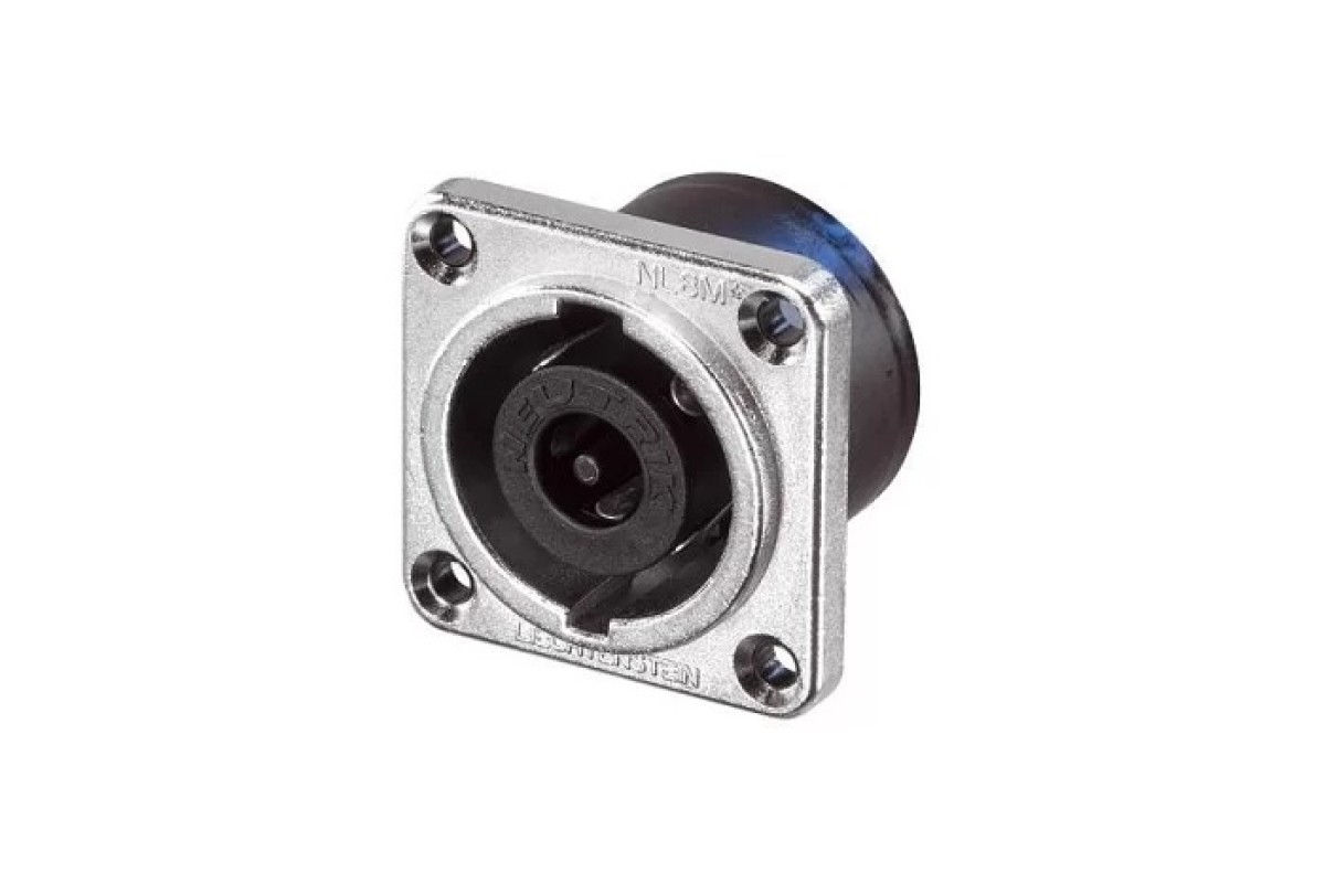 Панельный разъем SPEAKON для подключения громкоговорителей/усилителей, 8-й контактный <штекер/папа>, черный корпус из термопластика, квадратный металлический фланец G-типа, сквозные отверстия, плоские контакты 3/16", надежная поворотная система блокировки, оптимизация для использования в динамике. В/ток 40 А, под пайку.