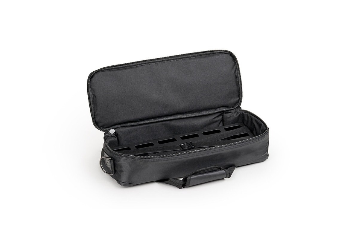 Оригинальная легкая жесткая и крепкая конструкция основана на одном изогнутом листе алюминия холодной прокатки и дополнена U-образными вертикальными скобами для дополнительной стабильности. Инновационный слотированный дизайн площадки не только отличается изяществом и лаконичностью, но также позволяет спрятать коммутационные кабели и разместить от 4 до 7 педалей. А для удобства хранения и транспортировки RBO B 2.1 DUO комплектуется фирменной сумкой с ремнем через плечо.