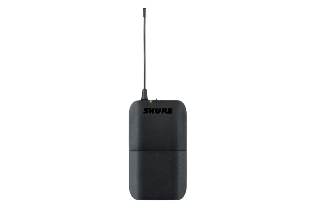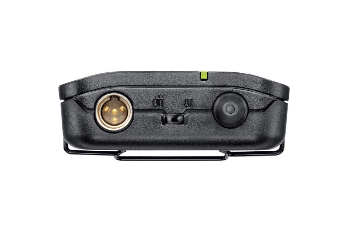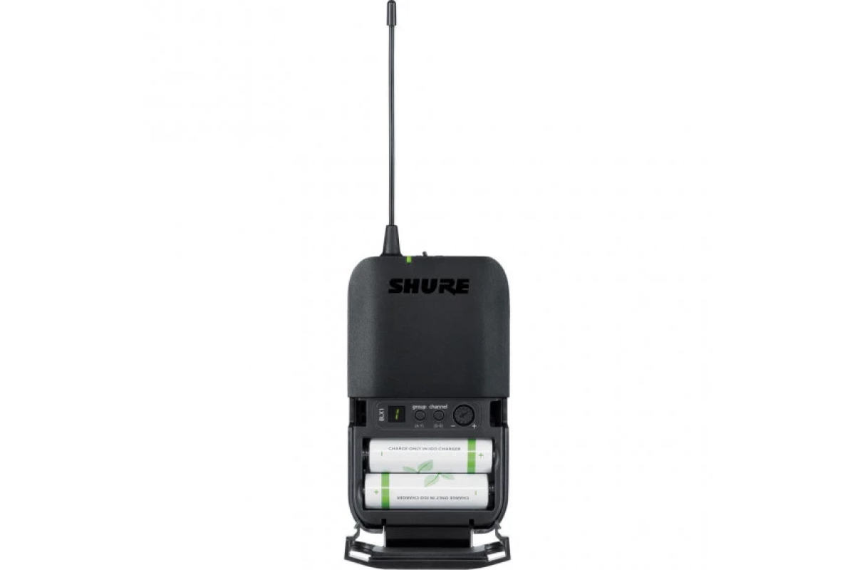 Shure BLX1-H8E – поясной передатчик, рабочий диапазон до 100 м, подключение TQG, управление усилением, питание от 2 батарей АА, до 14 часов работы.