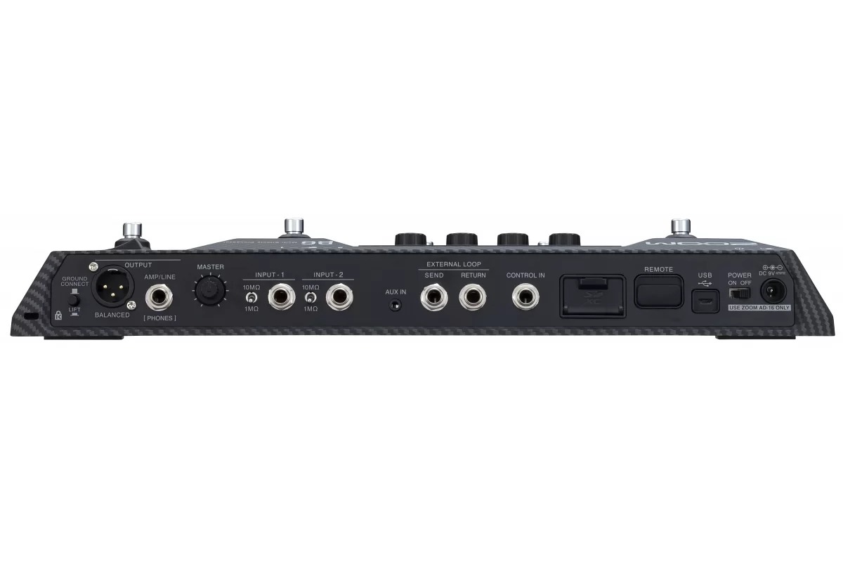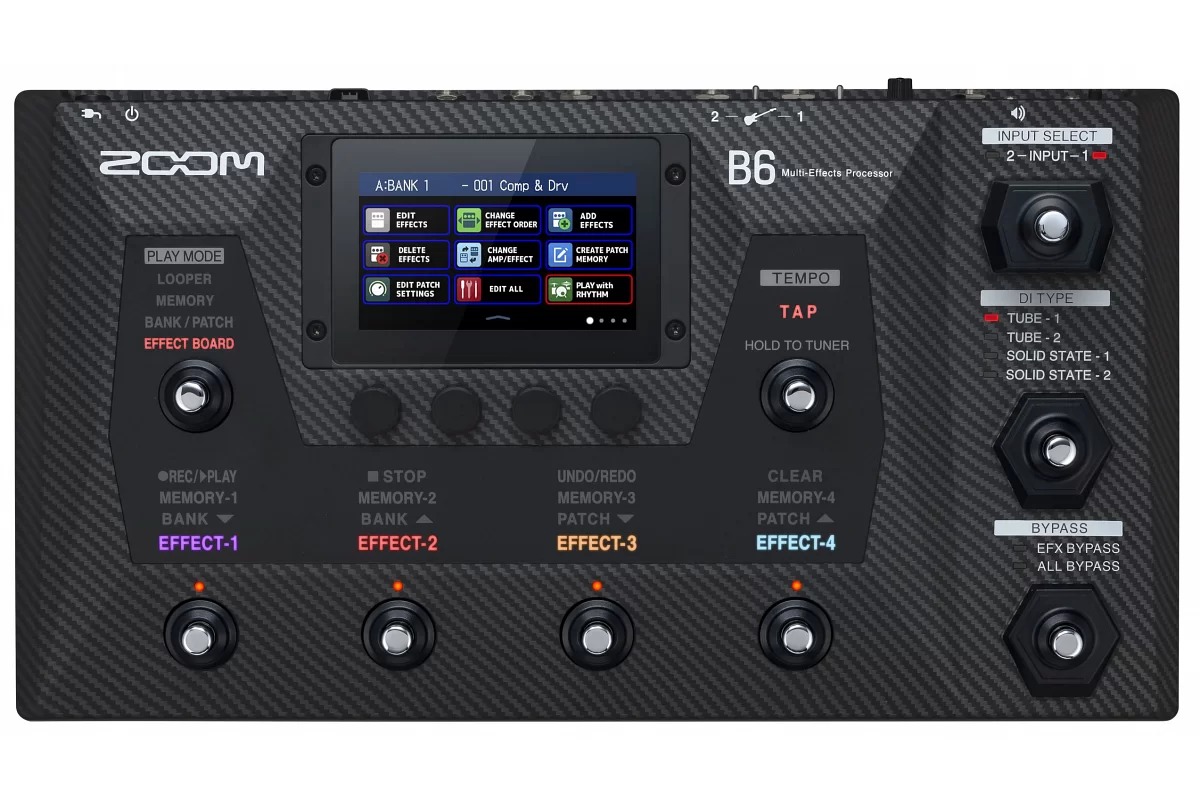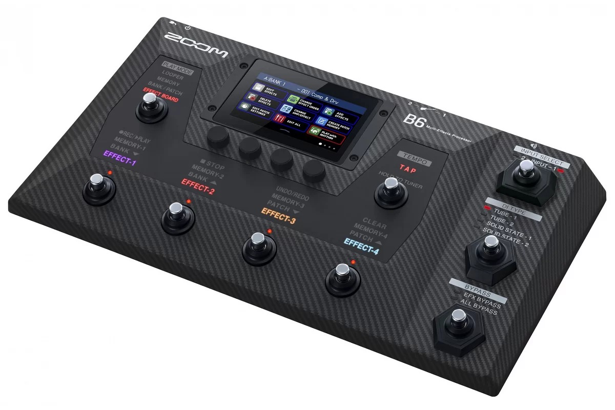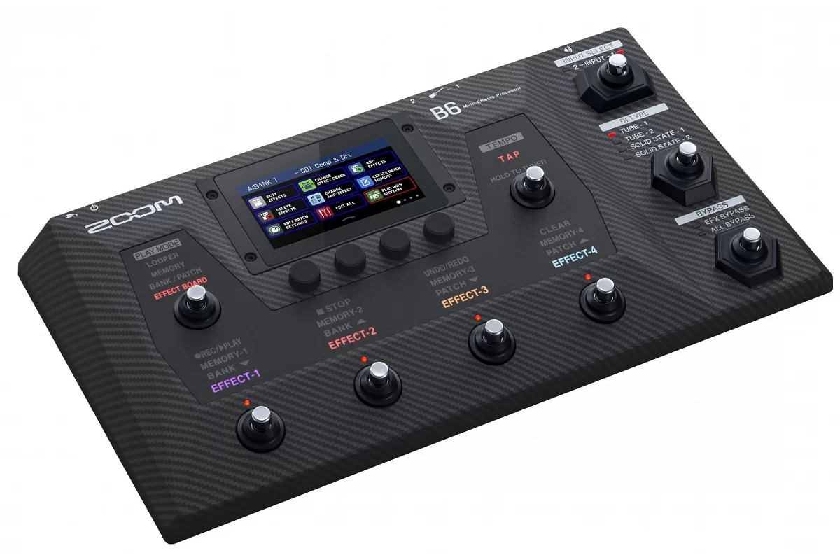 Zoom B6 – басовый процессор эффектов с функцией моделирования усилителей, ламповых/транзисторных дибоксов и кабинетов, лупером, библиотекой ритмических паттернов и встроенным USB-аудиоинтерфейсом. B6 эмулирует 12 классических басовых кабинетов с тремя вариантами расположения микрофона. В процессоре встроена коллекция фирменных эффектов от Zoom. При подключении к компьютеру через порт micro-USB процессор можно использовать в качестве аудиоинтерфейса с двумя входами и двумя выходами.