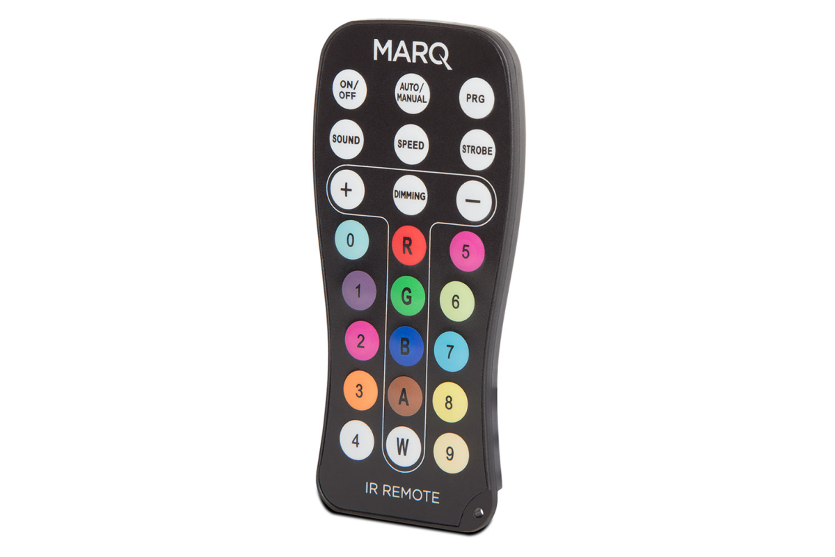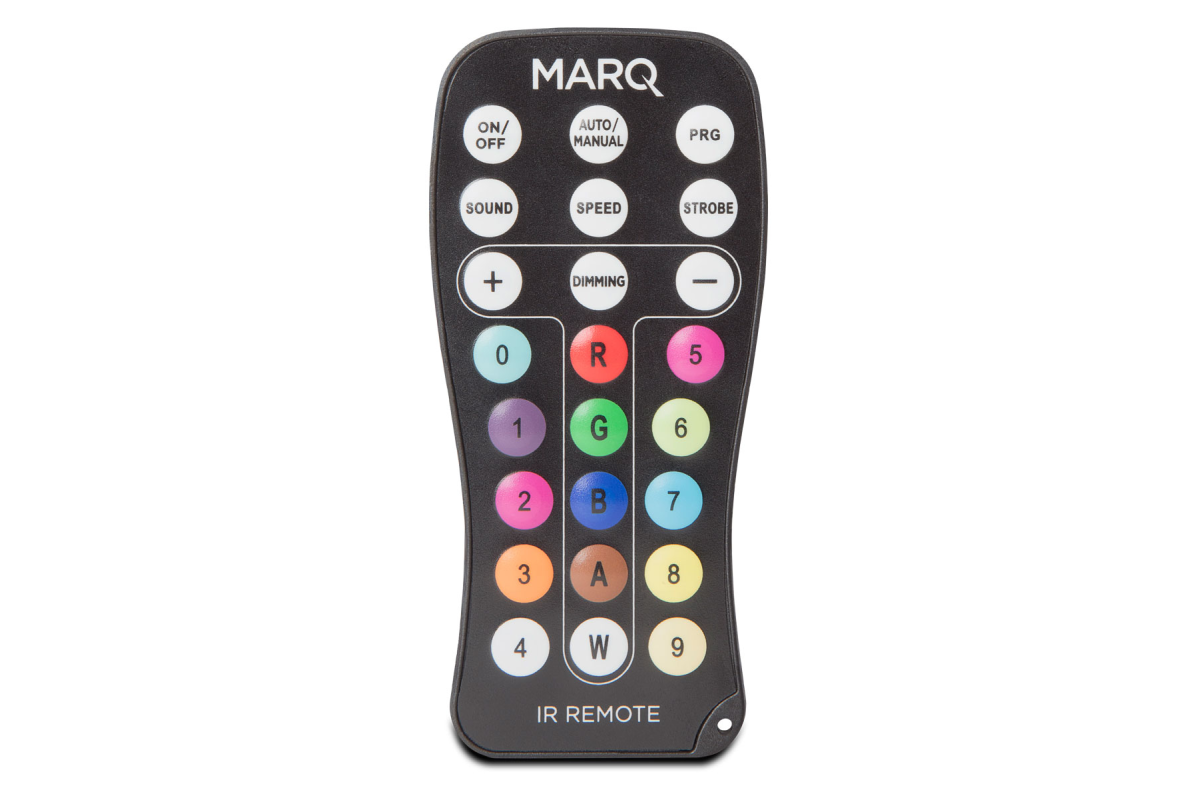 Colormax Remote – компактный и удобный инфракрасный пульт дистанционного управления для совместимых устройств Marq Lighting Colormax. Включайте и выключайте световые приборы, регулируйте яркость или воспользуйтесь установленными автоматическими приложениями и цветами, просто нажав одну кнопку.